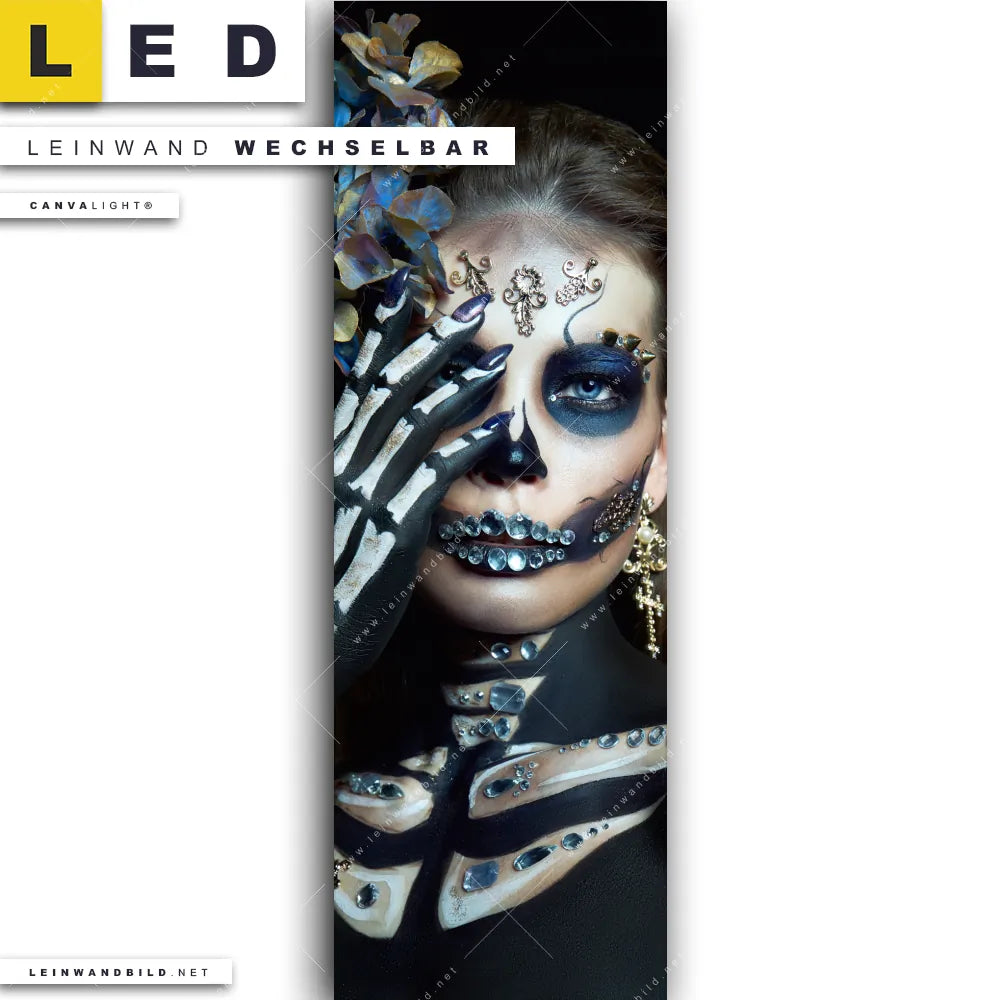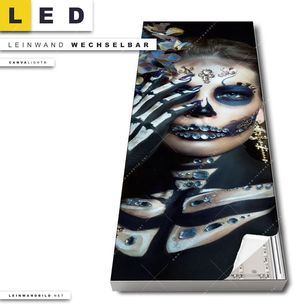 Du bist auf der Suche nach einem Porträts - Menschen LED Leinwandbild im Schmalen Format? Begriffe wie Frau, Porträt, modern, Beauty, Gesicht, Körper, Make-up, Totenkopf, Schädel, Halloween, Tag der Toten, Santa Muerte, Blumen haben Dich auf der Suche nach Deinem neuen XXL LED Wandbild mit wechselbarer Leinwand inspiriert? Farben wie Schwarz, Weiss, Blau dürfen auf Deinem neuen Leinwand-LED-Bild im Panorama-Hochformat nicht fehlen und Leuchtbilder im Modern Art, Schwarz - Weiss Stil passen perfekt zu Deinem Einrichtungsstil?