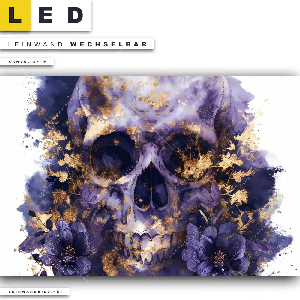 Du bist auf der Suche nach einem Porträts - Menschen, Blumen - Botanik LED Leinwandbild im Querformat? Begriffe wie Schädel, Totenkopf, Skelett, Knochen, Blumen, Blüten haben Dich auf der Suche nach Deinem neuen XXL LED Wandbild mit wechselbarer Leinwand inspiriert? Farben wie Weiss, Gold, Lila dürfen auf Deinem neuen breiten Leinwand-LED-Bild nicht fehlen und Leuchtbilder im Modern Art, Floral Stil passen perfekt zu Deinem Einrichtungsstil?