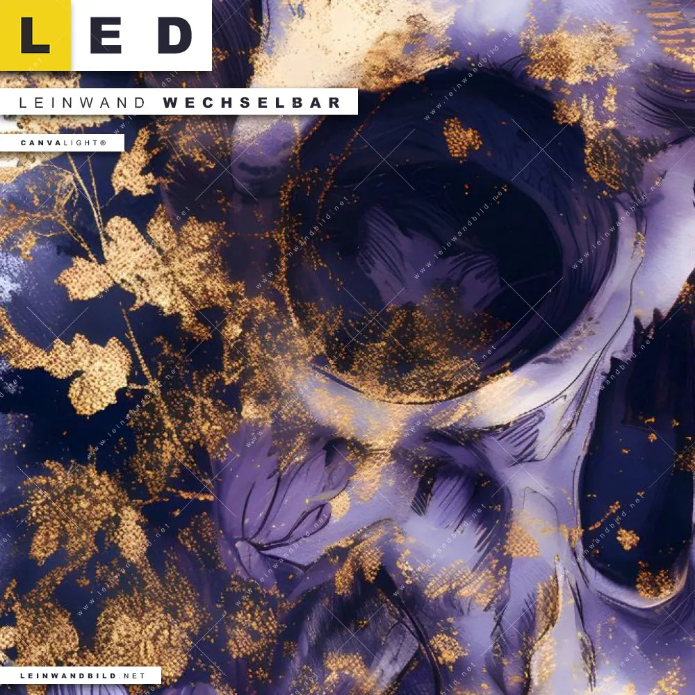 Dann sollte das LED Leinwandbild Canvalight® TEX | Mystische Schädelkunst | Querformat den Weg zu Dir finden. Das stufenlos dimmbare Leinwandbild Totenkopf in Gold und Lila im steckerfertigen Leuchtrahmen mit Fernbedienung und optionaler Farbtemperatursteuerung fügt sich als Eye-Catcher harmonisch in jedes Bar - Gastronomie, Wohnzimmer - Schlafzimmer, Flur - Eingangsbereich Raumkonzept ein.
