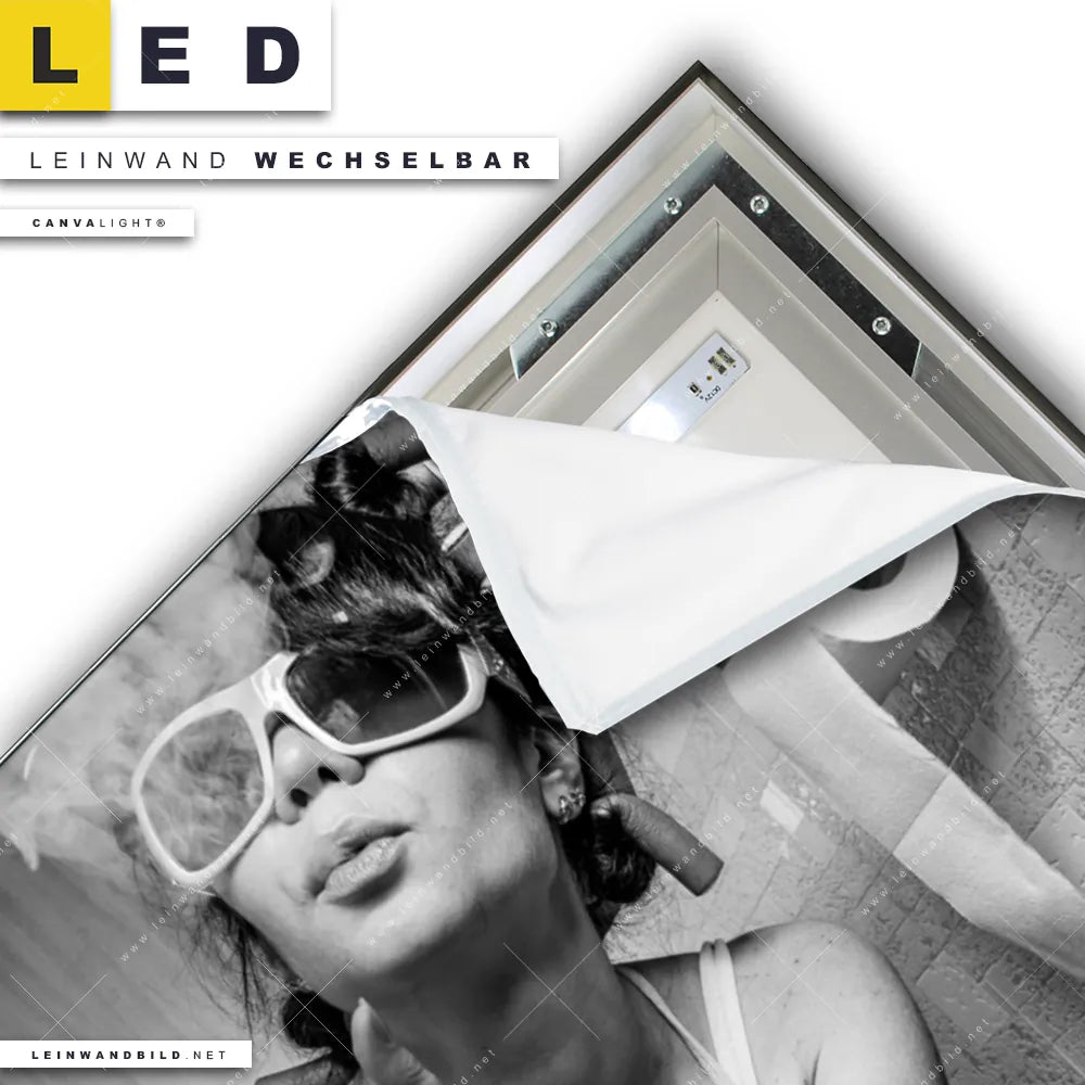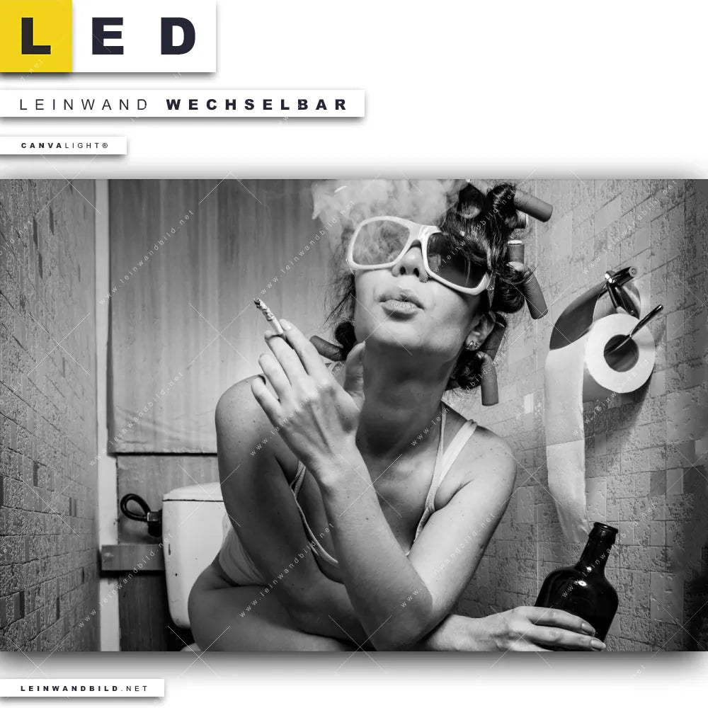 Du bist auf der Suche nach einem Porträts - Menschen LED Leinwandbild im Querformat? Begriffe wie Frau, Erotik, modern, sexy, Alkohol, Zigarette, rauchen, Toilette, WC, Party, Sonnenbrille haben Dich auf der Suche nach Deinem neuen XXL LED Wandbild mit wechselbarer Leinwand inspiriert? Farben wie Weiss, Schwarz, Grau dürfen auf Deinem neuen breiten Leinwand-LED-Bild nicht fehlen und Leuchtbilder im Modern Art, Schwarz - Weiss Stil passen perfekt zu Deinem Einrichtungsstil?