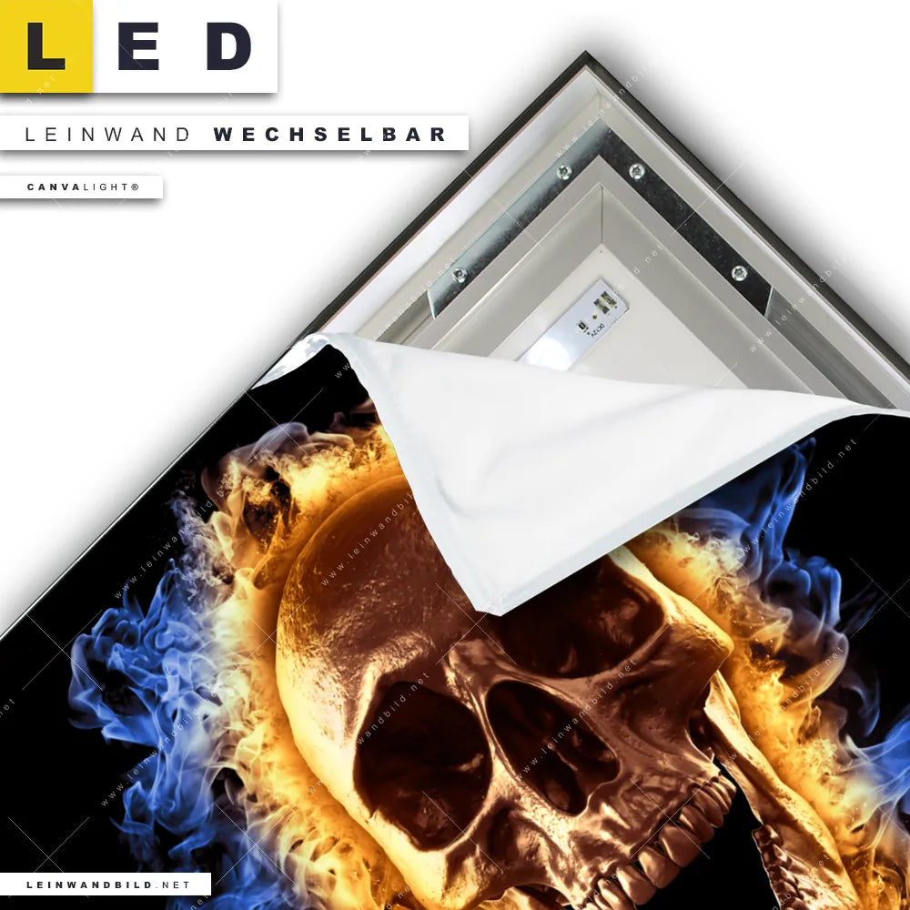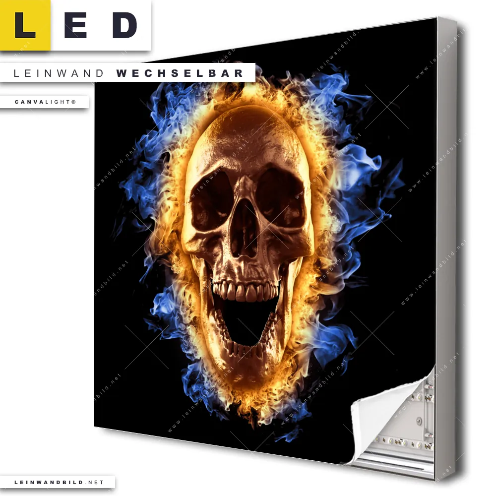 Du konfigurierst Dein individuelles LED Leinwandbild Canvalight® TEX | Schädel in Flammen | Quadrat und wir produzieren es NEU für Dich. Unsere Porträts - Menschen LED Bilder mit wechselbarer Textil-Leinwand sind KEINE Lagerware. Du bist Dir unsicher, welches Motiv oder Format das richtige für dein individuelles Canvalight® Leuchtbild ist, dann helfen wir dir gerne weiter und beraten dich!