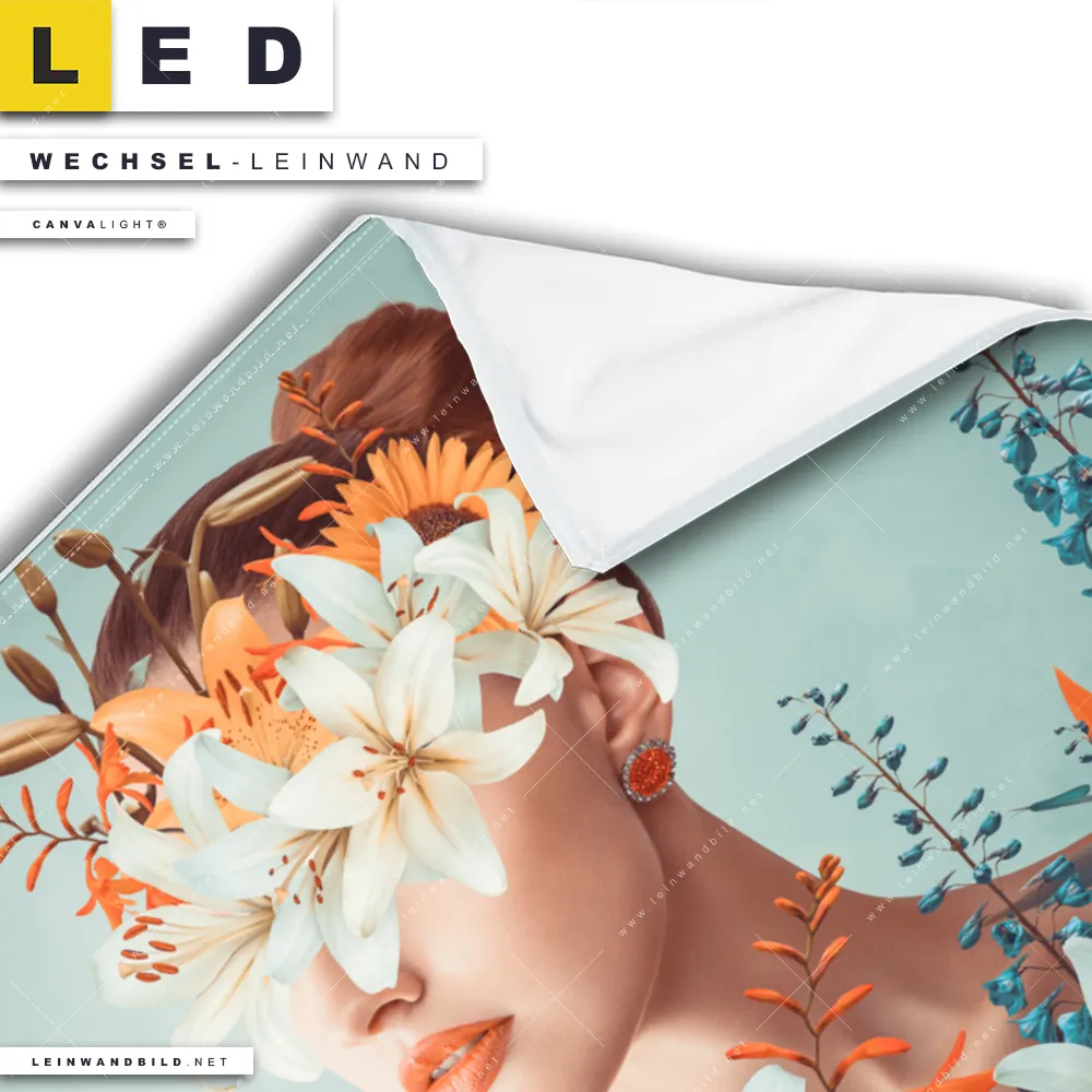 Du bist auf der Suche nach einer Porträts - Menschen, Blumen - Botanik Wechsel-Leinwand für Dein LED-Leinwandbild im Querformat? Begriffe wie Menschen & Blumen, Frau, Porträt, Gesicht, Blumen, Blüten, Frisur, Haare haben Dich auf der Suche nach Deiner Ersatz-Leinwand für dein breites LED Wandbild mit wechselbarer Leinwand inspiriert? Farben wie Orange, Hellblau, Weiss, Hellgrün dürfen auf Deinem neuen Wechselmotiv für Dein XXL Leinwand-LED-Bild nicht fehlen und Leinwände im Modern Art, Floral Stil für Leuchtbilder passen perfekt zu Deinem Einrichtungsstil?