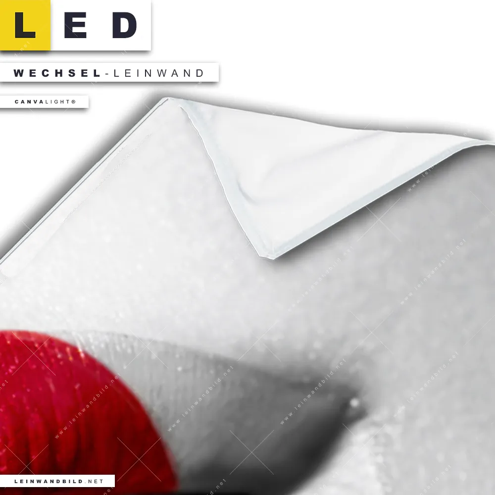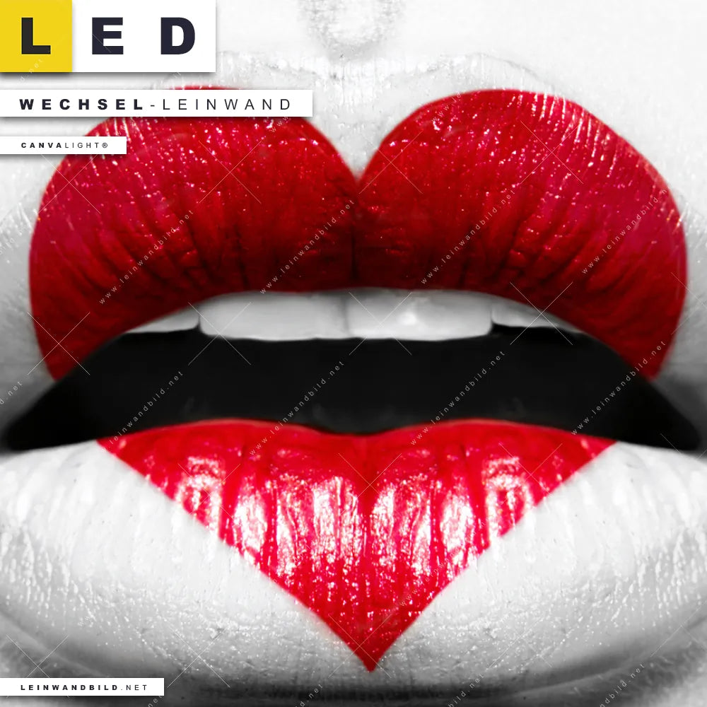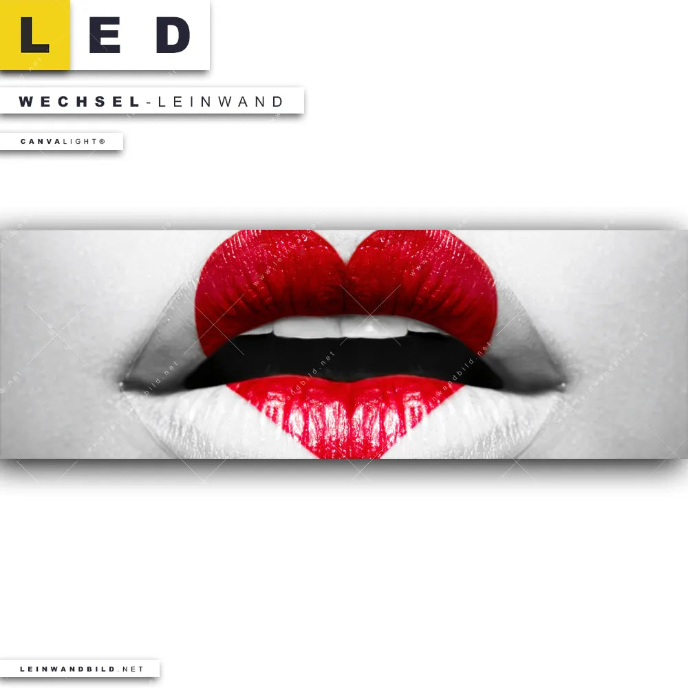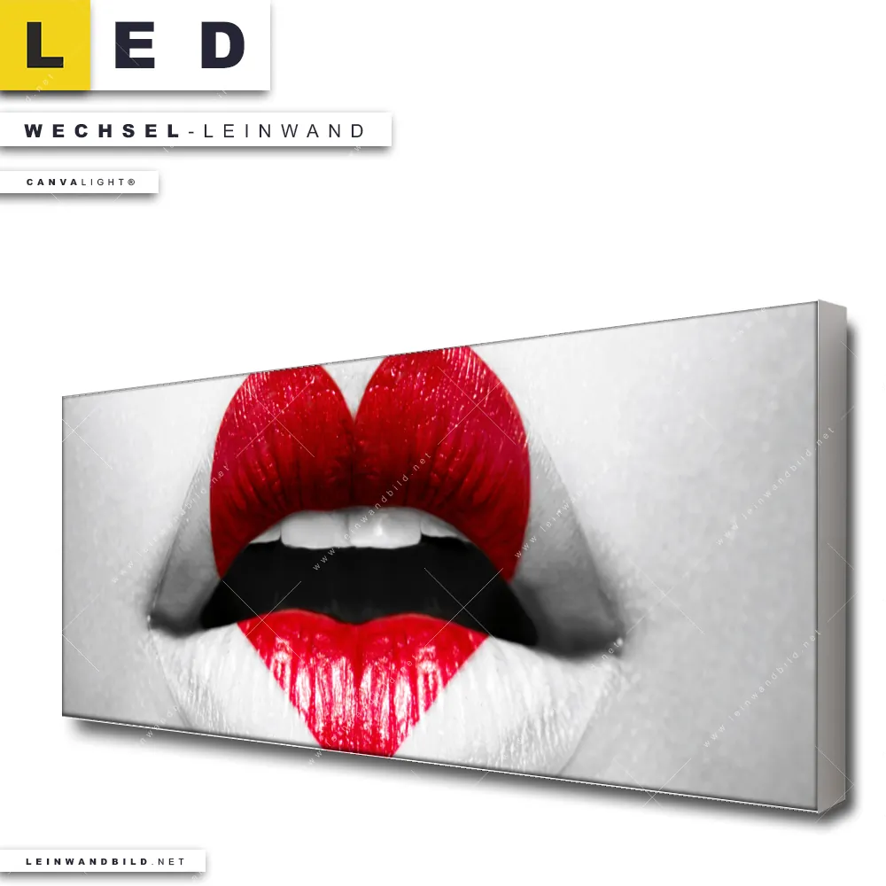 Dann sollte die Wechsel-Leinwand Canvalight® TEX | Herz-Mund | Panorama den Weg zu Dir finden. Die Austausch-Leinwand Liebesmund - passend für unsere stufenlos dimmbaren, steckerfertigen Leinwandbilder im LED Leuchtrahmen mit Fernbedienung und optionaler Farbtemperatursteuerung - fügt sich als Eye-Catcher harmonisch in jedes Bar - Gastronomie, Wohnzimmer - Schlafzimmer Raumkonzept ein.