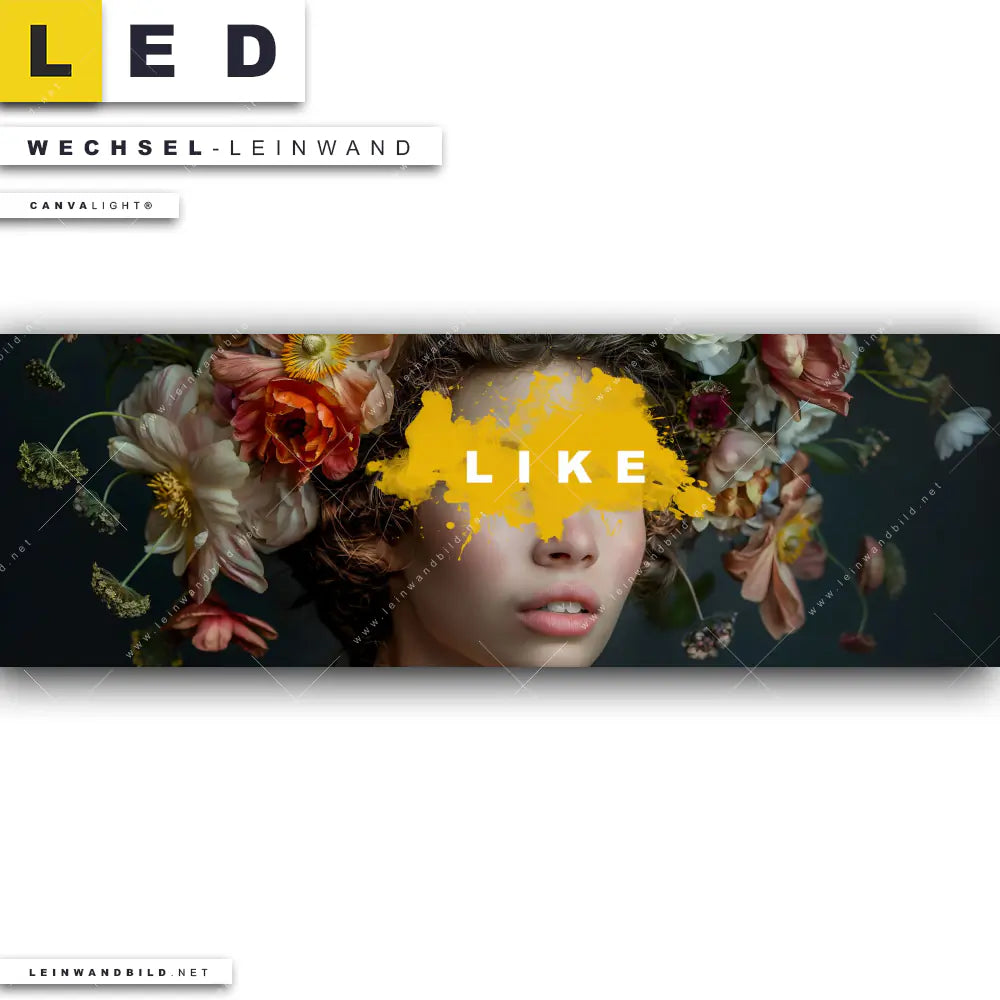 Dann sollte die Wechsel-Leinwand Canvalight® TEX | LIKE - Florales Porträt | Panorama den Weg zu Dir finden. Die Austausch-Leinwand Porträtkunst mit Blumen und Farbspritzern - passend für unsere stufenlos dimmbaren, steckerfertigen Leinwandbilder im LED Leuchtrahmen mit Fernbedienung und optionaler Farbtemperatursteuerung - fügt sich als Eye-Catcher harmonisch in jedes Friseur - Beauty, Wohnzimmer - Schlafzimmer, Flur - Eingangsbereich Raumkonzept ein.