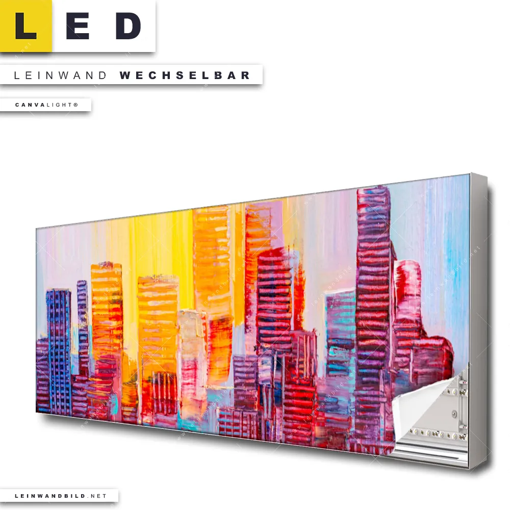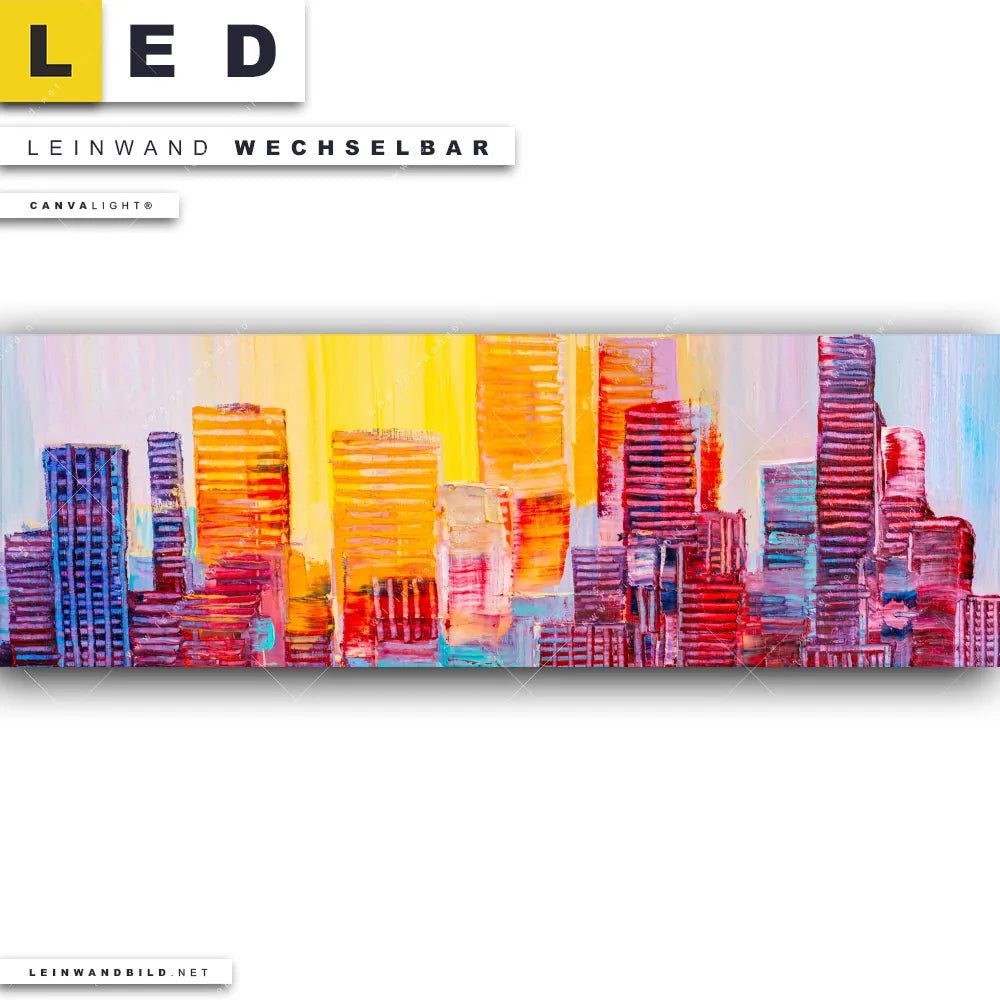 Du bist auf der Suche nach einem Städte - Skylines LED Leinwandbild im Panorama-Format? Begriffe wie Skyline, Metropole, Wolkenkratzer, Hochhäuser, Stadt, City, Kunst, Malerei, Sonnenuntergang - Sonnenaufgang haben Dich auf der Suche nach Deinem neuen XXL LED Wandbild mit wechselbarer Leinwand inspiriert? Farben wie Weiss, Schwarz, Blau, Rot, Rosa, Orange dürfen auf Deinem neuen extra breiten Leinwand-LED-Bild nicht fehlen und Leuchtbilder im Modern Art, Abstrakt Stil passen perfekt zu Deinem Einrichtungsstil?