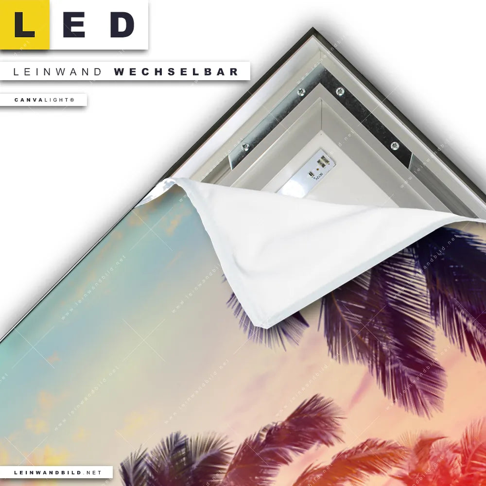 Du konfigurierst Dein individuelles LED Leinwandbild Canvalight® TEX | Palmen bei Sonnenuntergang | Hochformat und wir produzieren es NEU für Dich. Unsere Landschaften, Strand - Meer LED Bilder mit wechselbarer Textil-Leinwand sind KEINE Lagerware. Du bist Dir unsicher, welches Motiv oder Format das richtige für dein individuelles Canvalight® Leuchtbild ist, dann helfen wir dir gerne weiter und beraten dich!