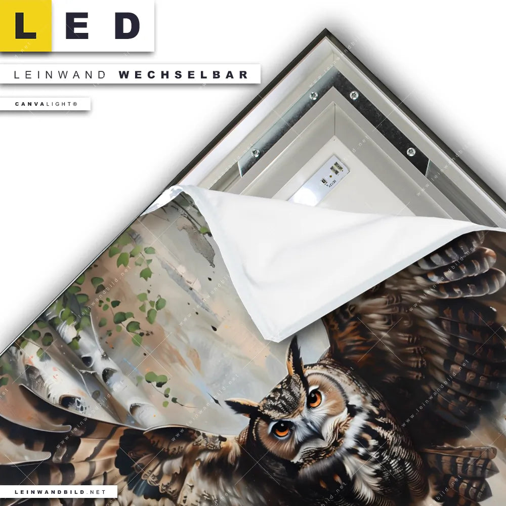 Dann sollte das LED Leinwandbild Canvalight® TEX | Eule im Birkenwald | Quadrat den Weg zu Dir finden. Das stufenlos dimmbare Leinwandbild Uhu - Geheimnisvoller Waldwächter im steckerfertigen Leuchtrahmen mit Fernbedienung und optionaler Farbtemperatursteuerung fügt sich als Eye-Catcher harmonisch in jedes Flur - Eingangsbereich, Wohnzimmer - Schlafzimmer, Arzt - Praxis Raumkonzept ein.