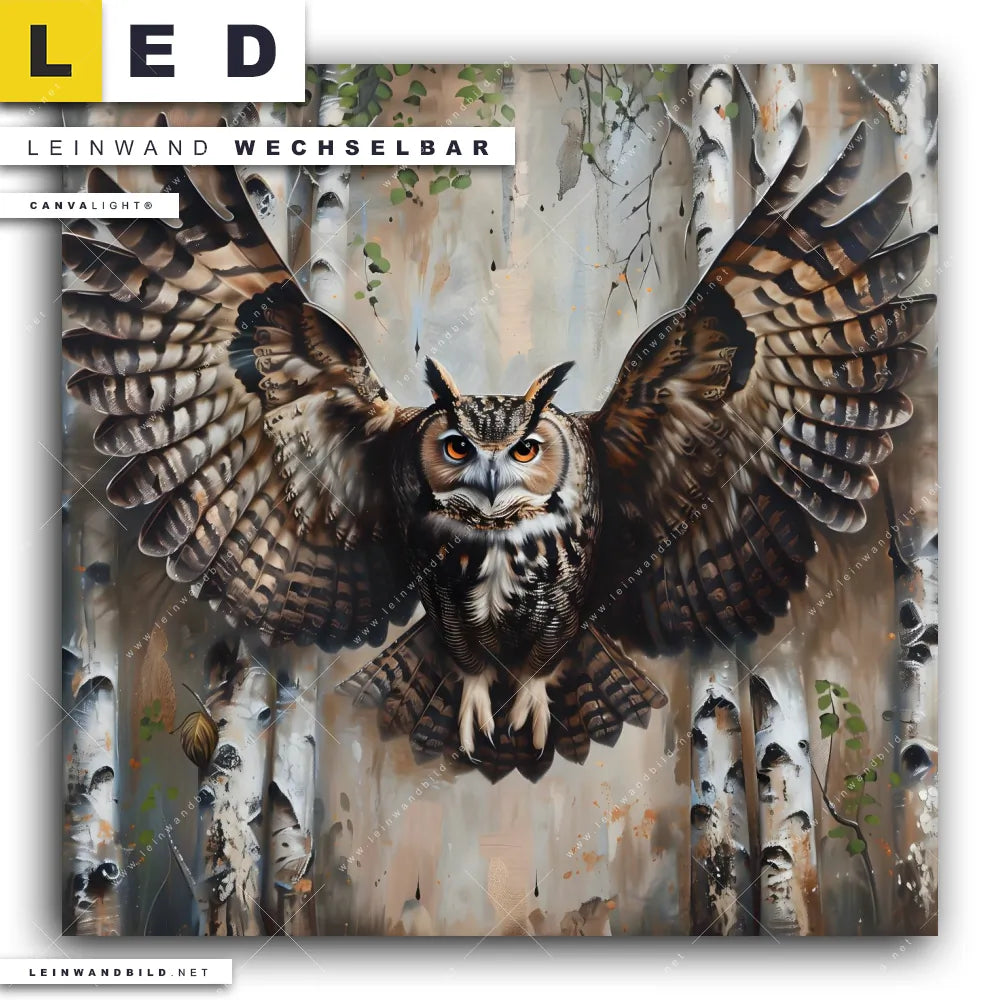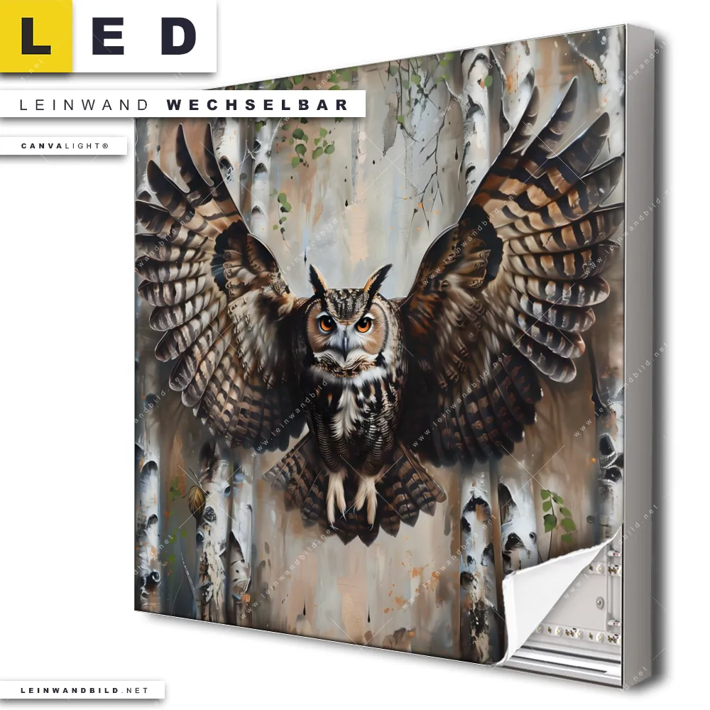 Du bist auf der Suche nach einem Tierwelt, Wald - Bäume LED Leinwandbild im Quadratischen Format? Begriffe wie Vogel, Eule, Uhu, Kauz, Tier, Tierporträt, Wald, Birken, Birkenwald haben Dich auf der Suche nach Deinem neuen XXL LED Wandbild mit wechselbarer Leinwand inspiriert? Farben wie Braun, Beige, Weiss dürfen auf Deinem neuen Leinwand-LED-Bild nicht fehlen und Leuchtbilder im Retro - Vintage, Surreal - Fantasy Stil passen perfekt zu Deinem Einrichtungsstil?