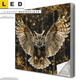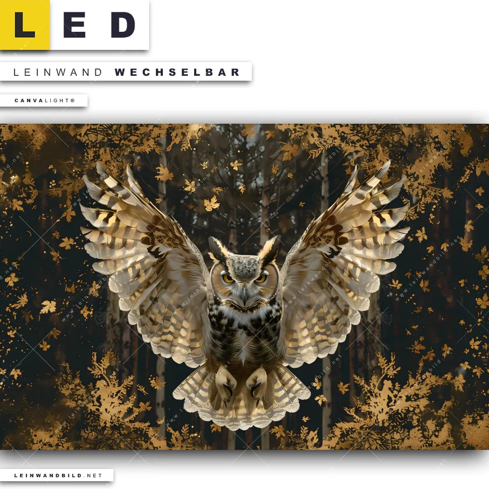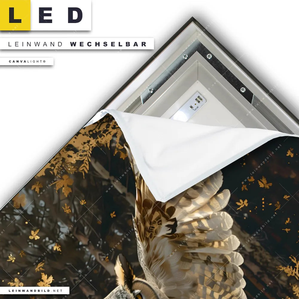 LED Leinwandbild Canvalight® TEX | Eule inmitten goldener Blätter | Querformat