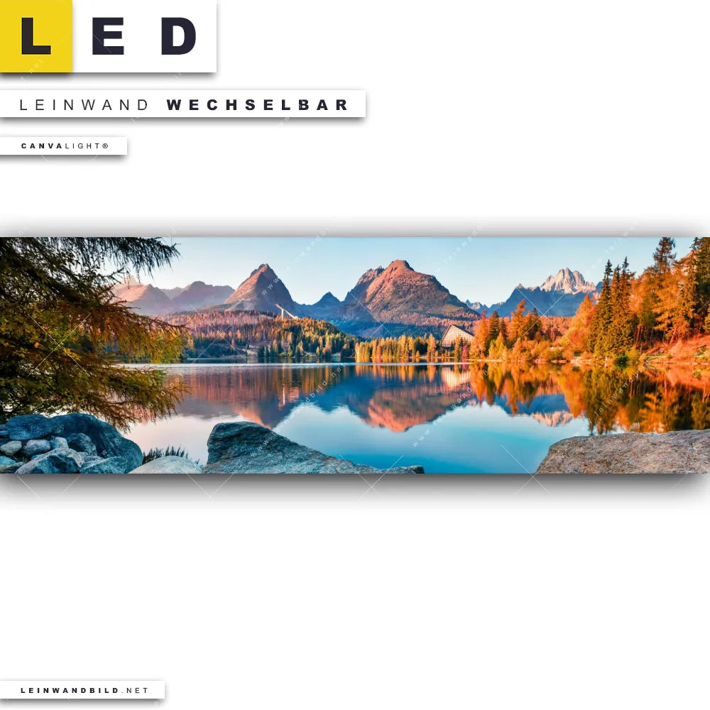 Du bist auf der Suche nach einem Landschaften LED Leinwandbild im Panorama-Format? Begriffe wie Wasserspiegelung, Bergsee, Gebirge, Berge, Slowakei, Bäume, Steine, See, Wasser, Natur, Reisen, Urlaub haben Dich auf der Suche nach Deinem neuen XXL LED Wandbild mit wechselbarer Leinwand inspiriert? Farben wie Braun, Blau, Beige dürfen auf Deinem neuen extra breiten Leinwand-LED-Bild nicht fehlen und Leuchtbilder im Natürlich - Realistisch Stil passen perfekt zu Deinem Einrichtungsstil?