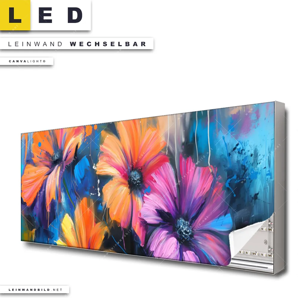 Du bist auf der Suche nach einem Blumen - Botanik LED Leinwandbild im Panorama-Format? Begriffe wie Blumen, Pflanze, Natur, Blüten, Blumenwiese haben Dich auf der Suche nach Deinem neuen XXL LED Wandbild mit wechselbarer Leinwand inspiriert? Farben wie Blau, Orange, Lila, Pink dürfen auf Deinem neuen extra breiten Leinwand-LED-Bild nicht fehlen und Leuchtbilder im Abstrakt, Floral, Modern Art Stil passen perfekt zu Deinem Einrichtungsstil?