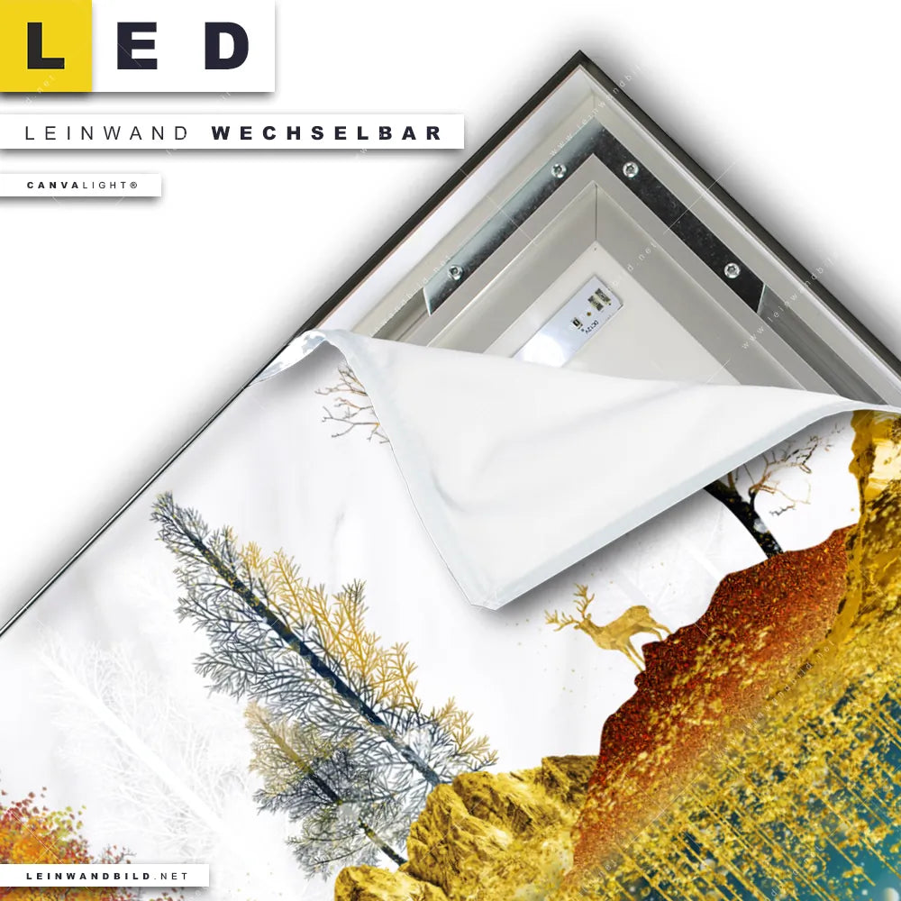 Du bist auf der Suche nach einem Landschaften LED Leinwandbild im Quadratischen Format? Begriffe wie Abstrakt, Modern, Kunst, Landschaft, Bäume, Tiere, Wald, Hirsch, Rotwild, Berge haben Dich auf der Suche nach Deinem neuen XXL LED Wandbild mit wechselbarer Leinwand inspiriert? Farben wie Weiss, Schwarz, Beige, Gold, Ocker, Orange dürfen auf Deinem neuen Leinwand-LED-Bild nicht fehlen und Leuchtbilder im Abstrakt, Modern Art Stil passen perfekt zu Deinem Einrichtungsstil?