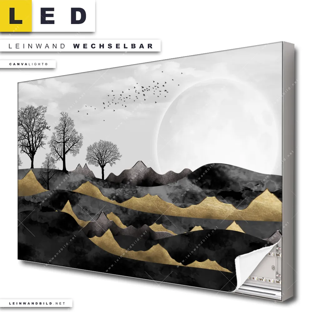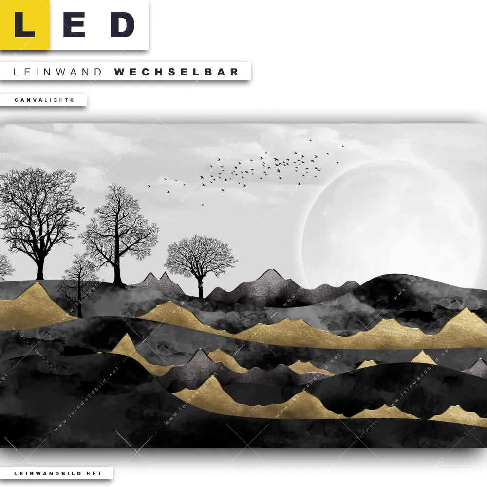 Du bist auf der Suche nach einem Landschaften LED Leinwandbild im Querformat? Begriffe wie Abstrakt, Modern, Kunst, Landschaft, Bäume, Wald, Berge, Vögel haben Dich auf der Suche nach Deinem neuen XXL LED Wandbild mit wechselbarer Leinwand inspiriert? Farben wie Weiss, Schwarz, Beige, Gold dürfen auf Deinem neuen breiten Leinwand-LED-Bild nicht fehlen und Leuchtbilder im Abstrakt, Modern Art, Schwarz - Weiss Stil passen perfekt zu Deinem Einrichtungsstil?