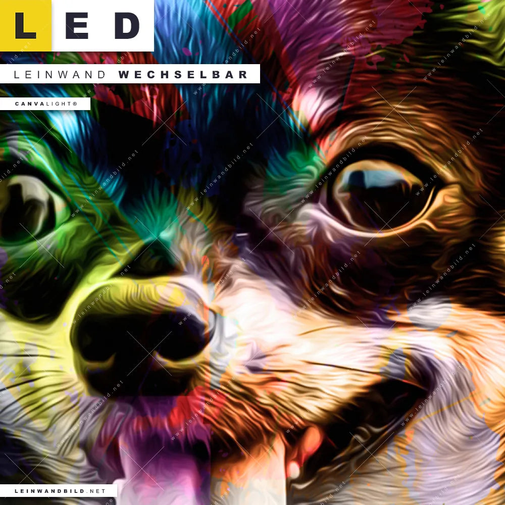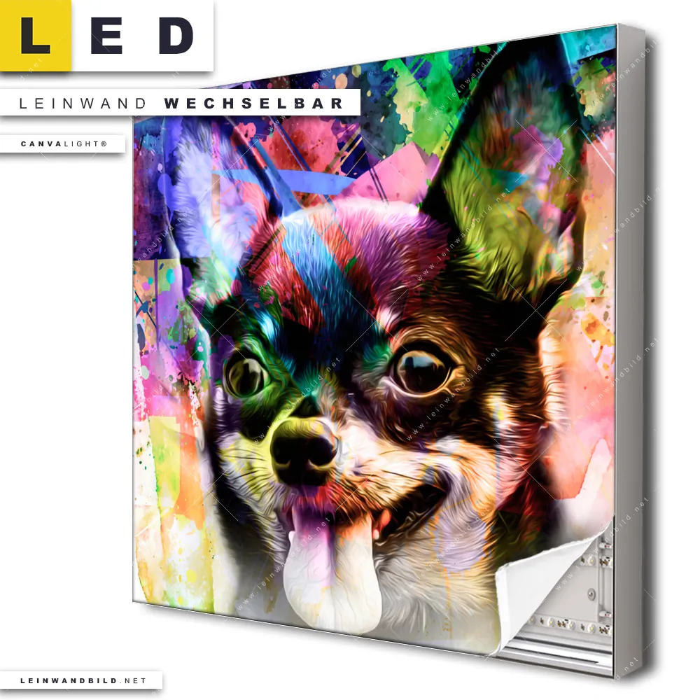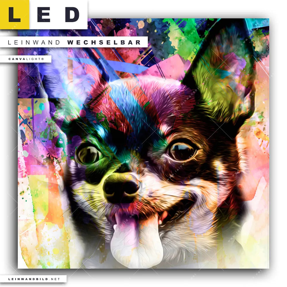 Du bist auf der Suche nach einem Tierwelt LED Leinwandbild im Quadratischen Format? Begriffe wie Chihuahua, Tier, Hund haben Dich auf der Suche nach Deinem neuen XXL LED Wandbild mit wechselbarer Leinwand inspiriert? Farben wie Bunt dürfen auf Deinem neuen Leinwand-LED-Bild nicht fehlen und Leuchtbilder im Abstrakt, Grunge, Mixed Media, Modern Art, Pop Art, Street Art Stil passen perfekt zu Deinem Einrichtungsstil?