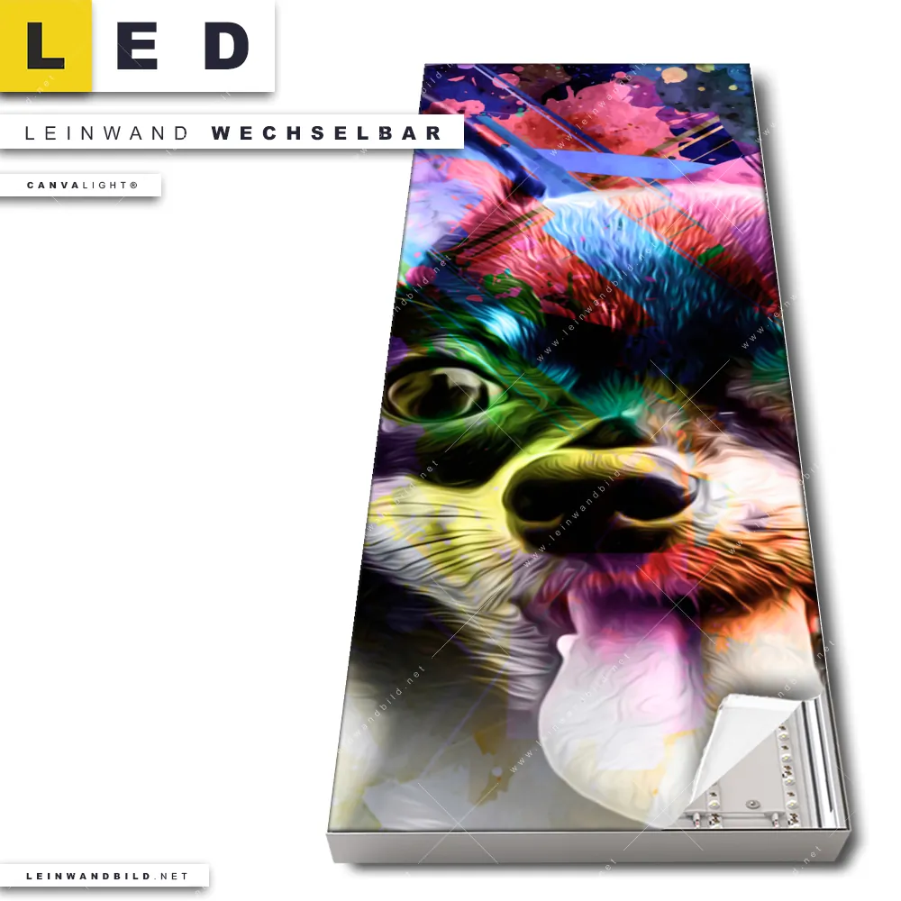 Du konfigurierst Dein individuelles LED Leinwandbild Canvalight® TEX | Abstrakter Chihuahua | Schmal und wir produzieren es NEU für Dich. Unsere Tierwelt LED Bilder mit wechselbarer Textil-Leinwand sind KEINE Lagerware. Du bist Dir unsicher, welches Motiv oder Format das richtige für dein individuelles Canvalight® Leuchtbild ist, dann helfen wir dir gerne weiter und beraten dich!