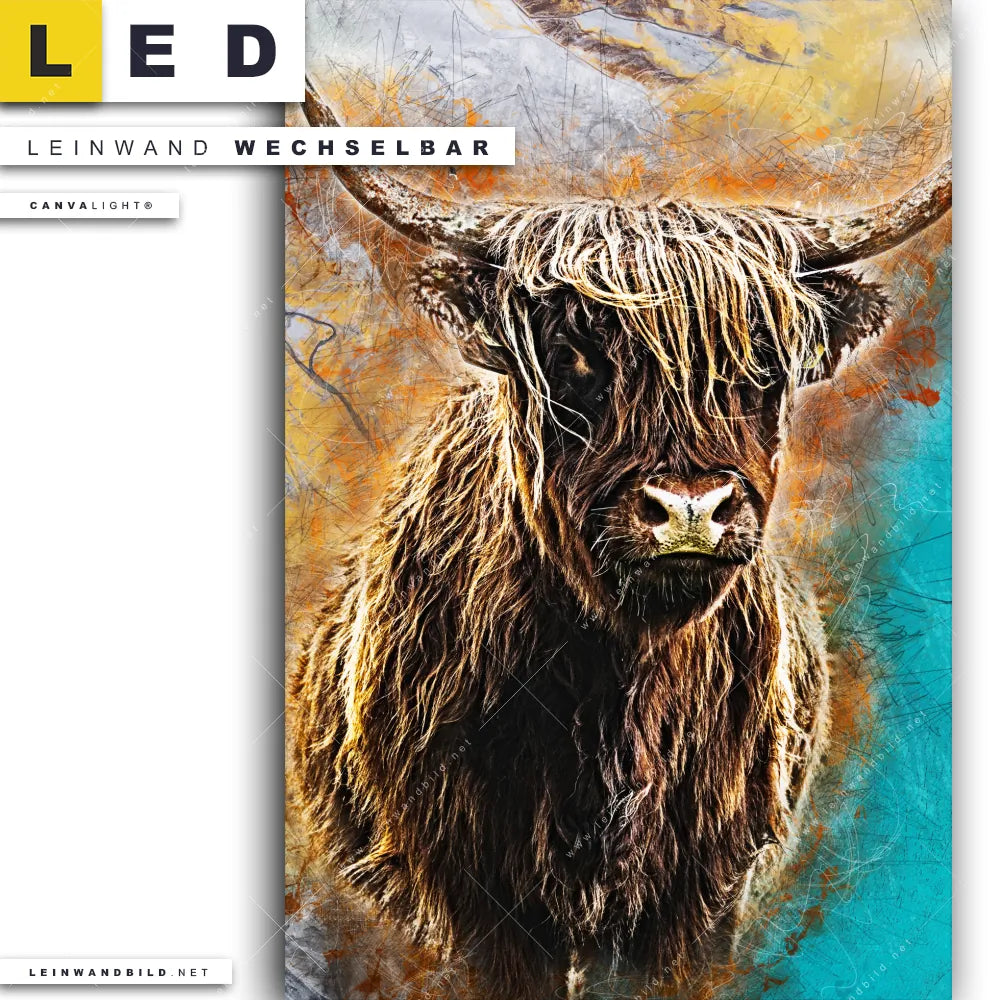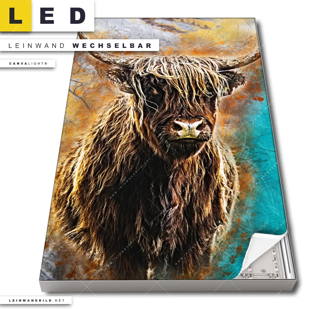 Du bist auf der Suche nach einem Tierwelt LED Leinwandbild im Hochformat? Begriffe wie Tier, Stier, Hochlandkuh, Highlander, Büffel, Hochlandrind, Rind, Kuh, Hörner, Bulle haben Dich auf der Suche nach Deinem neuen XXL LED Wandbild mit wechselbarer Leinwand inspiriert? Farben wie Braun, Türkis, Beige dürfen auf Deinem neuen Leinwand-LED-Bild nicht fehlen und Leuchtbilder im Abstrakt, Grunge, Mixed Media, Modern Art Stil passen perfekt zu Deinem Einrichtungsstil?