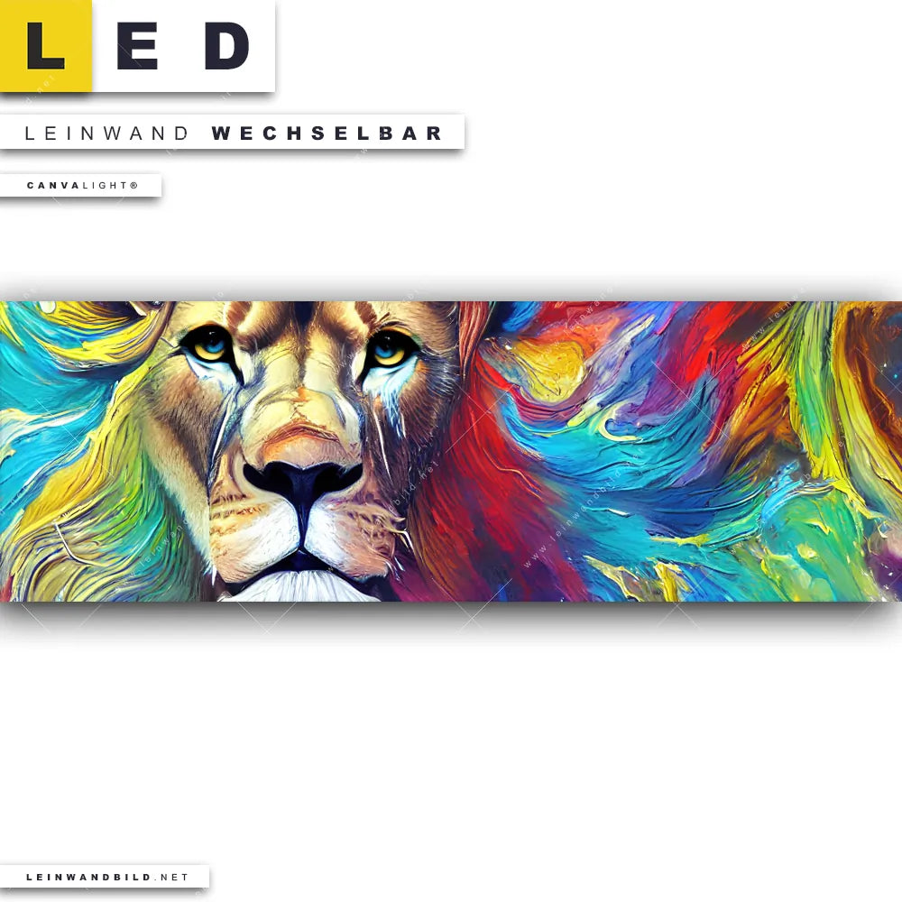 Du bist auf der Suche nach einem Tierwelt LED Leinwandbild im Panorama-Format? Begriffe wie Raubkatze, Löwe, Afrika, Dschungel, Lion, Graffiti, König, Löwenkopf, Wildtier, Farbe, Farbexplosion, Farbspritzer, Porträt haben Dich auf der Suche nach Deinem neuen XXL LED Wandbild mit wechselbarer Leinwand inspiriert? Farben wie Bunt, Beige dürfen auf Deinem neuen extra breiten Leinwand-LED-Bild nicht fehlen und Leuchtbilder im Abstrakt, Modern Art, Pop Art, Street Art Stil passen perfekt zu Deinem Einrichtungsstil?