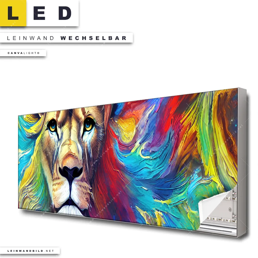 Du konfigurierst Dein individuelles LED Leinwandbild Canvalight® TEX | Abstrakter Löwenkopf | Panorama und wir produzieren es NEU für Dich. Unsere Tierwelt LED Bilder mit wechselbarer Textil-Leinwand sind KEINE Lagerware. Du bist Dir unsicher, welches Motiv oder Format das richtige für dein individuelles Canvalight® Leuchtbild ist, dann helfen wir dir gerne weiter und beraten dich!