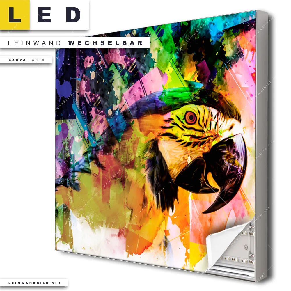 Du bist auf der Suche nach einem Tierwelt LED Leinwandbild im Quadratischen Format? Begriffe wie Vogel, Papagei, Dschungel, Farbspritzer, Farbexplosion, Farbe haben Dich auf der Suche nach Deinem neuen XXL LED Wandbild mit wechselbarer Leinwand inspiriert? Farben wie Bunt dürfen auf Deinem neuen Leinwand-LED-Bild nicht fehlen und Leuchtbilder im Abstrakt, Grunge, Mixed Media, Modern Art, Pop Art, Street Art Stil passen perfekt zu Deinem Einrichtungsstil?
