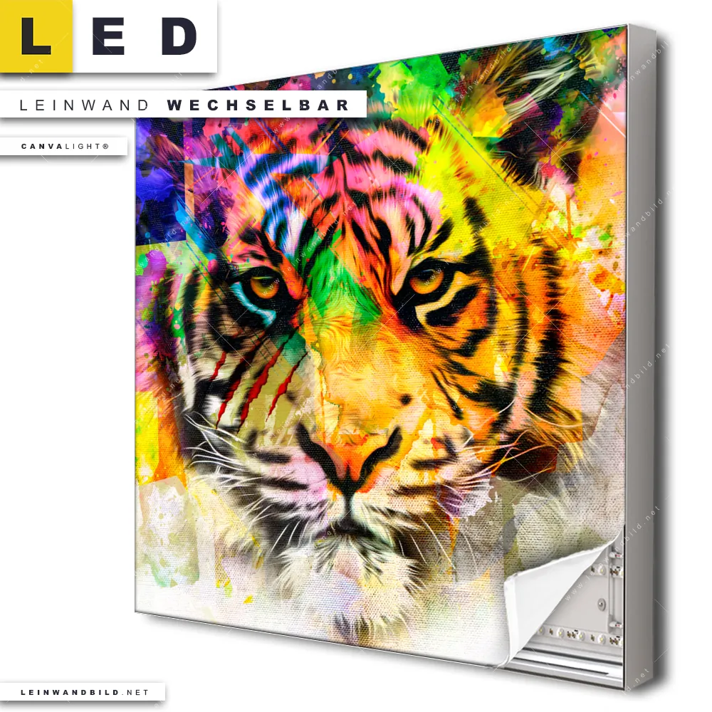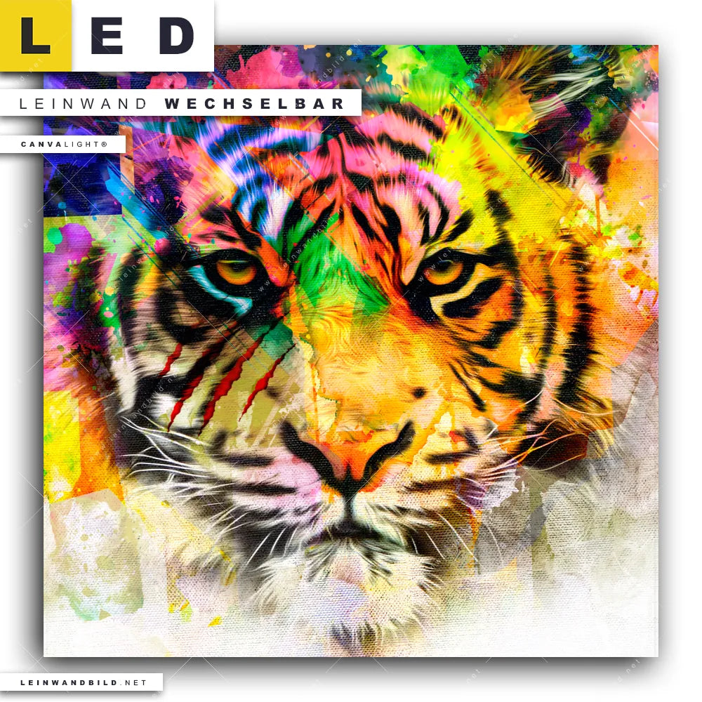Du bist auf der Suche nach einem Tierwelt LED Leinwandbild im Quadratischen Format? Begriffe wie Raubkatze, Tiger, Afrika, Dschungel, Farbspritzer, Farbe, Farbexplosion, Portät haben Dich auf der Suche nach Deinem neuen XXL LED Wandbild mit wechselbarer Leinwand inspiriert? Farben wie Bunt dürfen auf Deinem neuen Leinwand-LED-Bild nicht fehlen und Leuchtbilder im Abstrakt, Modern Art, Pop Art, Street Art Stil passen perfekt zu Deinem Einrichtungsstil?