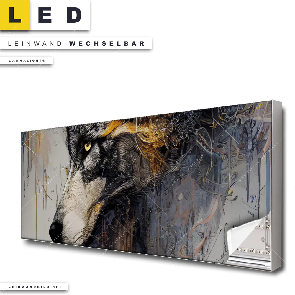 LED Leinwandbild Canvalight® TEX | Abstrakter Wolf in Gold und Grau | Panorama