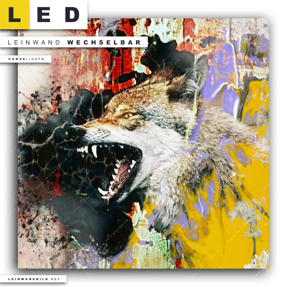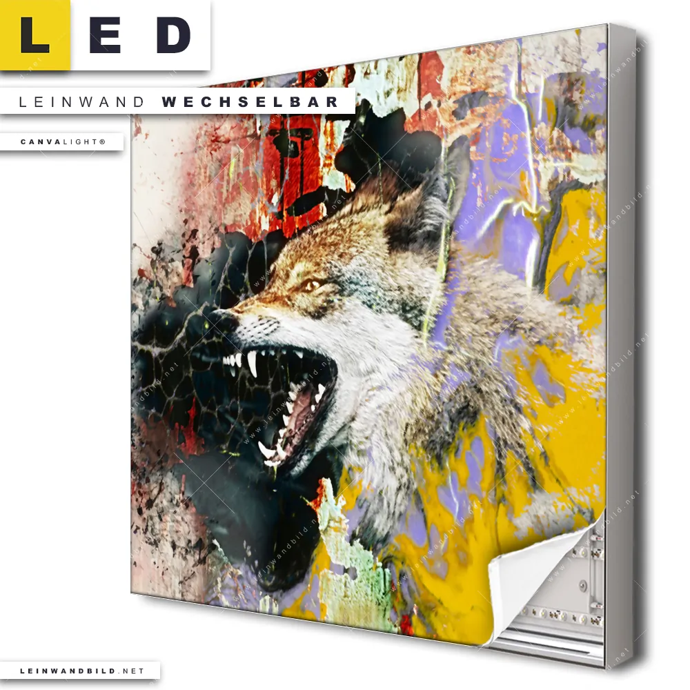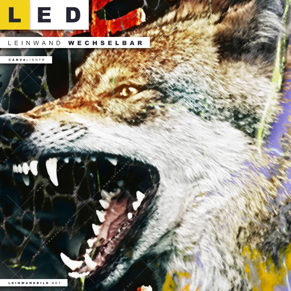 Dann sollte das LED Leinwandbild Canvalight® TEX | Abstrakter Wolf | Quadrat den Weg zu Dir finden. Das stufenlos dimmbare Leinwandbild Wolf mit offenem Maul in Farbchaos im steckerfertigen Leuchtrahmen mit Fernbedienung und optionaler Farbtemperatursteuerung fügt sich als Eye-Catcher harmonisch in jedes Bar - Gastronomie, Büro - Kanzlei, Flur - Eingangsbereich, Wohnzimmer - Schlafzimmer Raumkonzept ein.