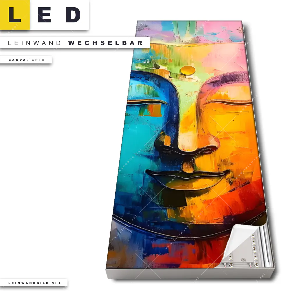 Du konfigurierst Dein individuelles LED Leinwandbild Canvalight® TEX | Abstraktes Buddha-Gesicht | Schmal und wir produzieren es NEU für Dich. Unsere Buddha - Feng Shui LED Bilder mit wechselbarer Textil-Leinwand sind KEINE Lagerware. Du bist Dir unsicher, welches Motiv oder Format das richtige für dein individuelles Canvalight® Leuchtbild ist, dann helfen wir dir gerne weiter und beraten dich!