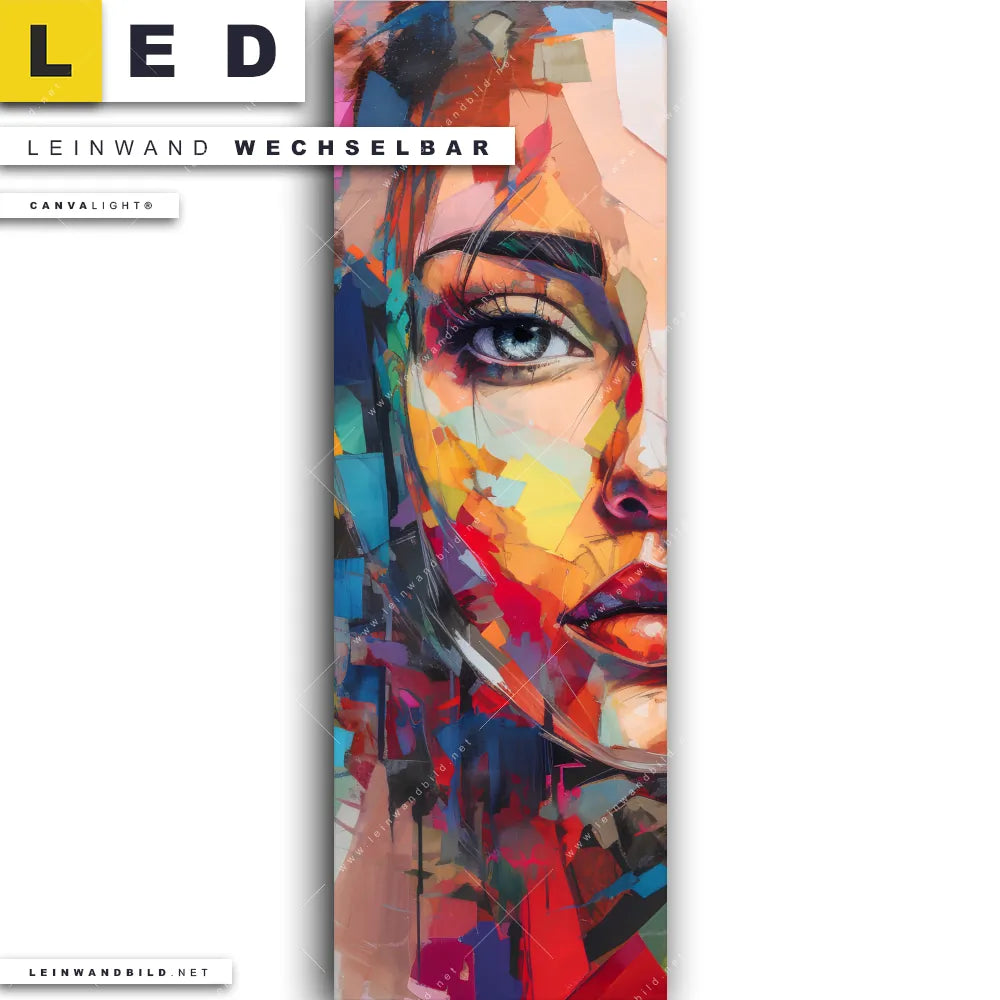 Du bist auf der Suche nach einem Porträts - Menschen LED Leinwandbild im Schmalen Format? Begriffe wie Kunst, Frau, Portrait, Gesicht, Mädchen, Dame, Acryl, Schönheit, Farbe haben Dich auf der Suche nach Deinem neuen XXL LED Wandbild mit wechselbarer Leinwand inspiriert? Farben wie Bunt dürfen auf Deinem neuen Leinwand-LED-Bild im Panorama-Hochformat nicht fehlen und Leuchtbilder im Abstrakt, Modern Art Stil passen perfekt zu Deinem Einrichtungsstil?