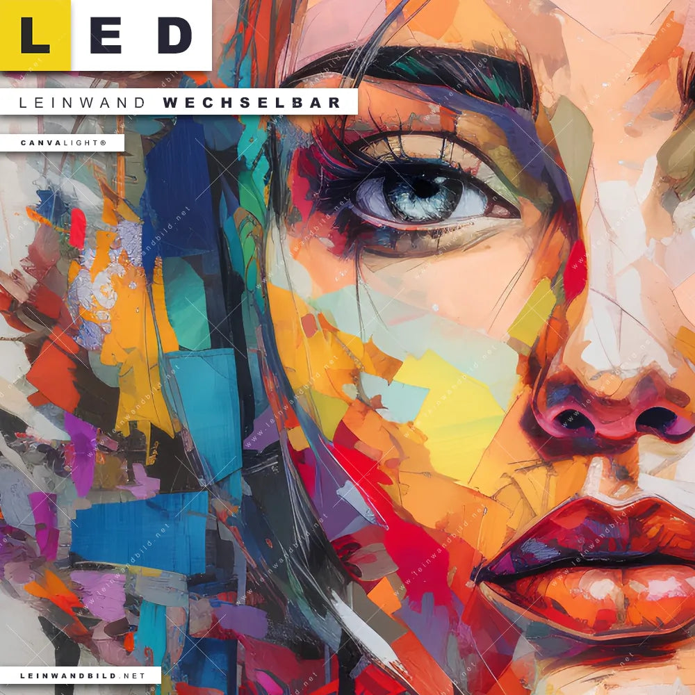 Begriffe wie Kunst, Frau, Portrait, Gesicht, Mädchen, Dame, Acryl, Schönheit, Farbe haben Dich auf der Suche nach Deinem neuen LED Wandbild mit beleuchteter Leinwand inspiriert? Dann sollte das LED Bild Buntes Gesicht einer Frau mit austauschbarer Textil-Fotoleinwand den Weg zu Dir finden.