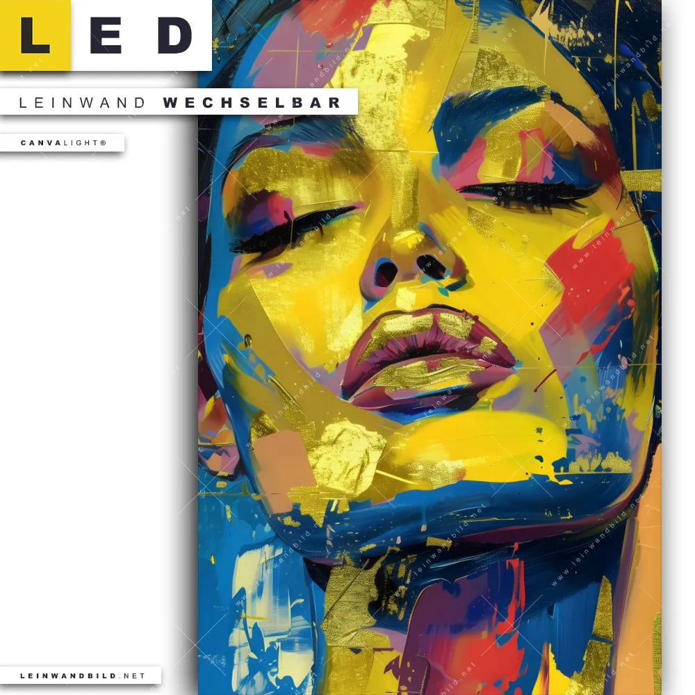 Du bist auf der Suche nach einem Porträts - Menschen LED Leinwandbild im Hochformat? Begriffe wie Frau, Portrait, Gesicht, Kunst, Mädchen, Dame, Acryl, Schönheit, Farbe haben Dich auf der Suche nach Deinem neuen XXL LED Wandbild mit wechselbarer Leinwand inspiriert? Farben wie Gelb , Gold, Blau, Pink dürfen auf Deinem neuen Leinwand-LED-Bild nicht fehlen und Leuchtbilder im Modern Art, Abstrakt Stil passen perfekt zu Deinem Einrichtungsstil?