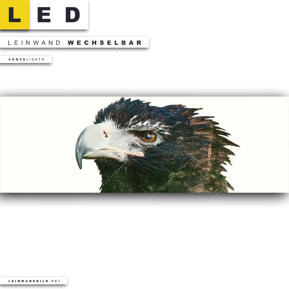 Du bist auf der Suche nach einem Tierwelt LED Leinwandbild im Panorama-Format? Begriffe wie Vogel, Adler, Wald, Doppelbelichtung, Natur, skandinavisch, Bäume haben Dich auf der Suche nach Deinem neuen XXL LED Wandbild mit wechselbarer Leinwand inspiriert? Farben wie Braun, Grün, Weiss dürfen auf Deinem neuen extra breiten Leinwand-LED-Bild nicht fehlen und Leuchtbilder im Modern Art, Mixed Media Stil passen perfekt zu Deinem Einrichtungsstil?