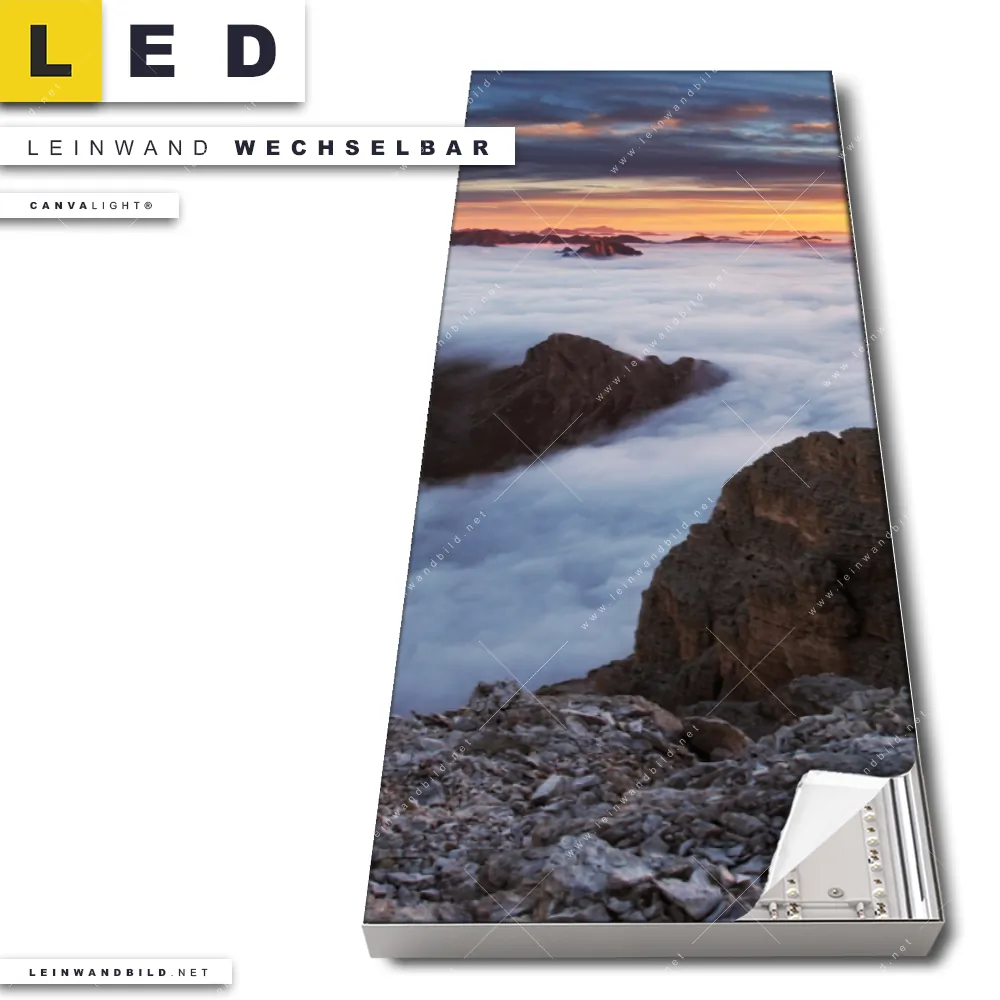 Du konfigurierst Dein individuelles LED Leinwandbild Canvalight® TEX | Alpen im Nebel | Schmal und wir produzieren es NEU für Dich. Unsere Landschaften LED Bilder mit wechselbarer Textil-Leinwand sind KEINE Lagerware. Du bist Dir unsicher, welches Motiv oder Format das richtige für dein individuelles Canvalight® Leuchtbild ist, dann helfen wir dir gerne weiter und beraten dich!