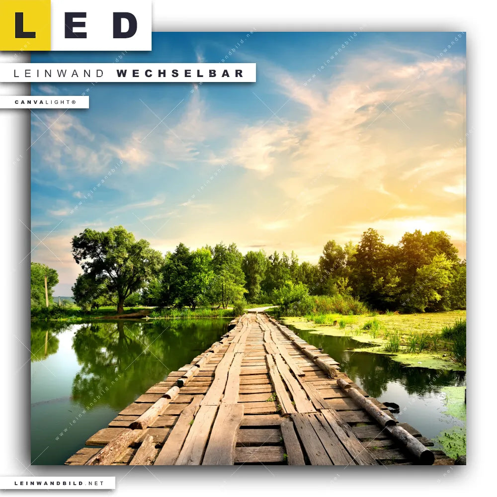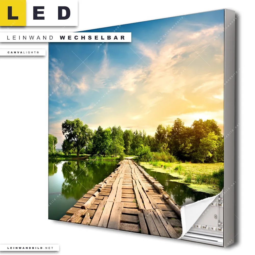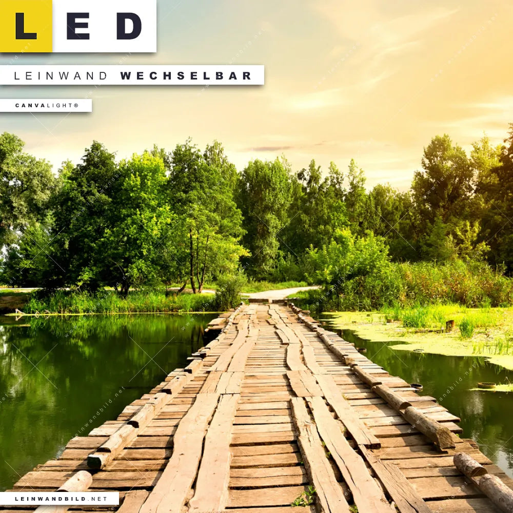 Dann sollte das LED Leinwandbild Canvalight® TEX | Alte Brücke am Fluss | Quadrat den Weg zu Dir finden. Das stufenlos dimmbare Leinwandbild Hölzener Steg am Fluss im steckerfertigen Leuchtrahmen mit Fernbedienung und optionaler Farbtemperatursteuerung fügt sich als Eye-Catcher harmonisch in jedes Arzt - Praxis, Wohnzimmer - Schlafzimmer, Küche - Esszimmer, Flur - Eingangsbereich, Büro - Kanzlei Raumkonzept ein.