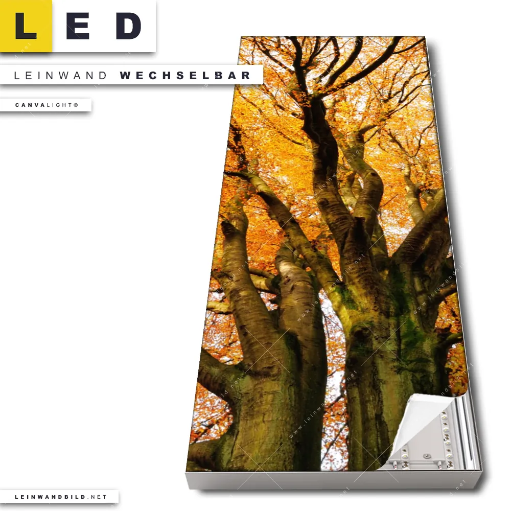 Dann sollte das LED Leinwandbild Canvalight® TEX | Alte Buche | Schmal den Weg zu Dir finden. Das stufenlos dimmbare Leinwandbild Große, herbstliche Baumkrone im steckerfertigen Leuchtrahmen mit Fernbedienung und optionaler Farbtemperatursteuerung fügt sich als Eye-Catcher harmonisch in jedes Arzt - Praxis, Büro - Kanzlei, Wohnzimmer - Schlafzimmer, Flur - Eingangsbereich, Bar - Gastronomie Raumkonzept ein.