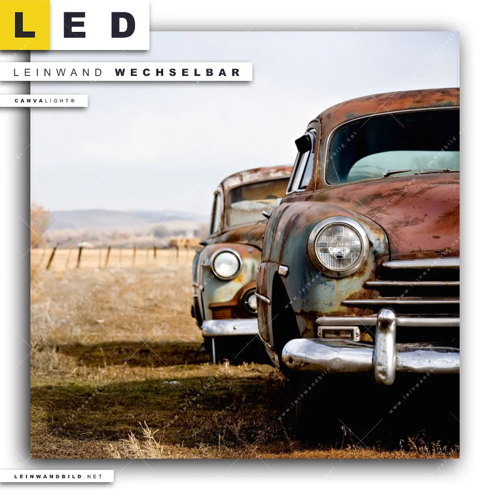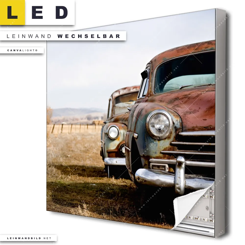 Du konfigurierst Dein individuelles LED Leinwandbild Canvalight® TEX | Alte rostige Autos | Quadrat und wir produzieren es NEU für Dich. Unsere Fahrzeuge LED Bilder mit wechselbarer Textil-Leinwand sind KEINE Lagerware. Du bist Dir unsicher, welches Motiv oder Format das richtige für dein individuelles Canvalight® Leuchtbild ist, dann helfen wir dir gerne weiter und beraten dich!
