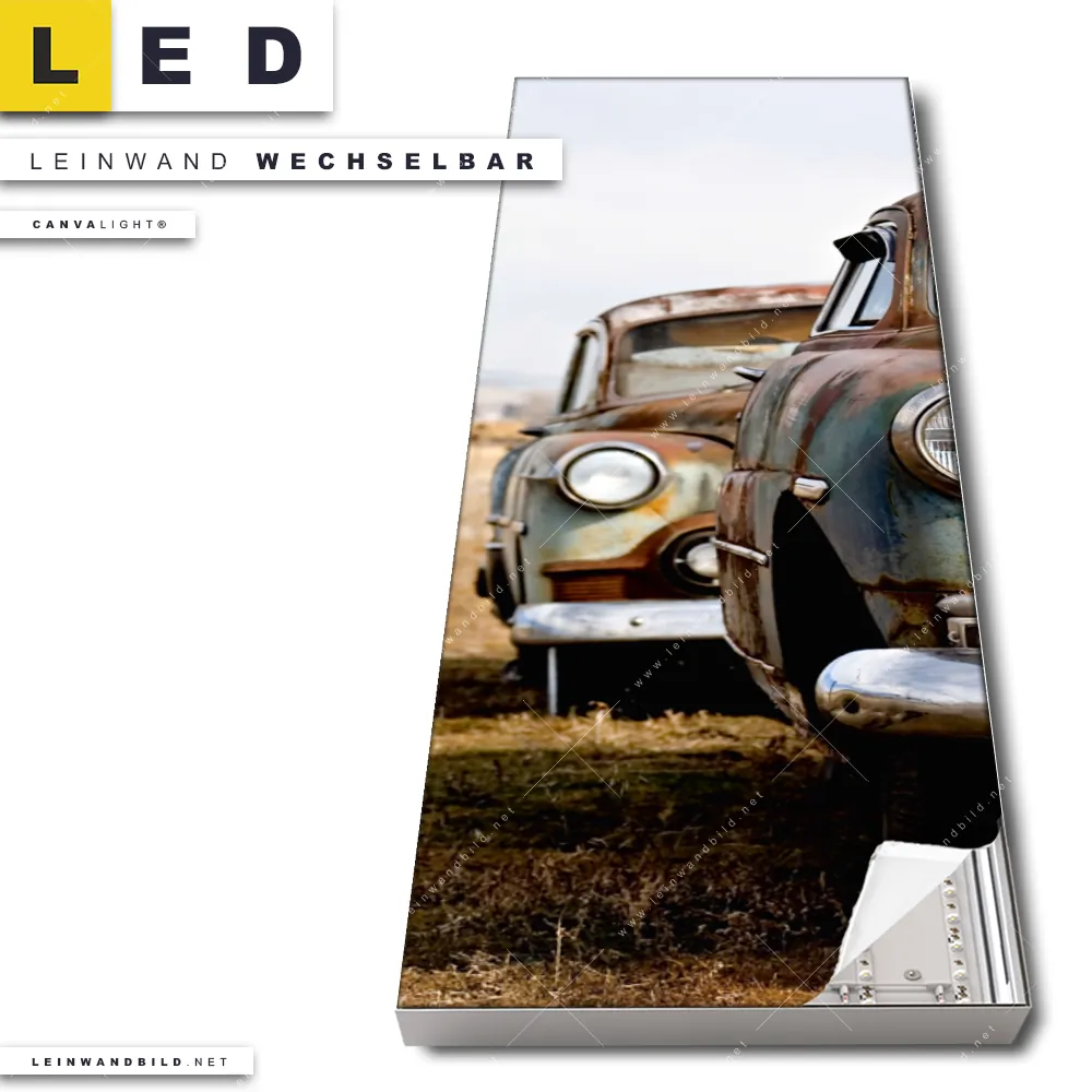 LED Leinwandbild Canvalight® TEX | Alte rostige Autos | Schmal