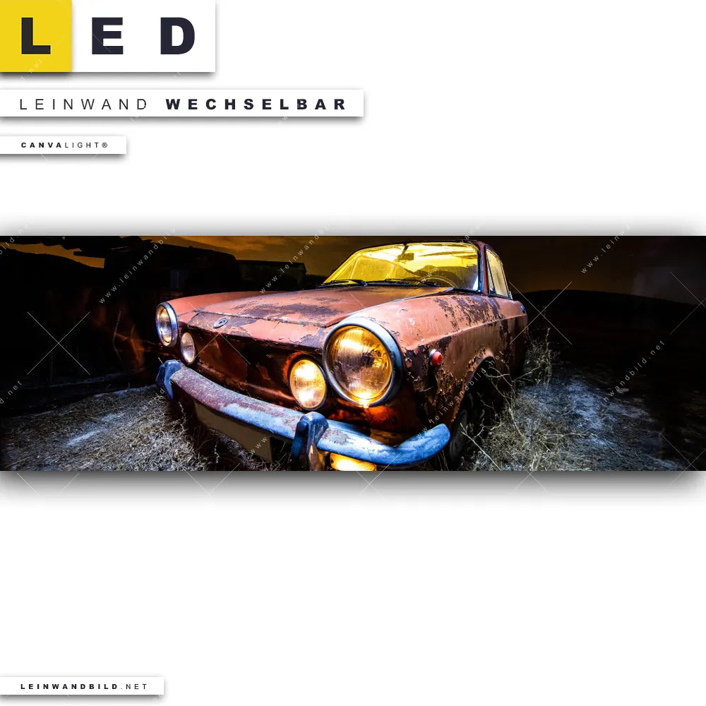 Du konfigurierst Dein individuelles LED Leinwandbild Canvalight® TEX | Altes Auto | Panorama und wir produzieren es NEU für Dich. Unsere Fahrzeuge LED Bilder mit wechselbarer Textil-Leinwand sind KEINE Lagerware. Du bist Dir unsicher, welches Motiv oder Format das richtige für dein individuelles Canvalight® Leuchtbild ist, dann helfen wir dir gerne weiter und beraten dich!