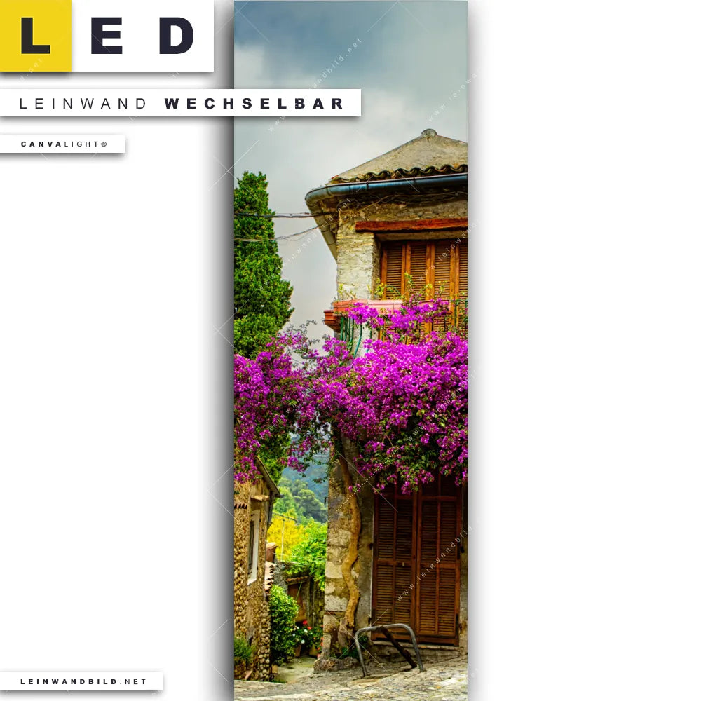 Du bist auf der Suche nach einem Architektur - Gebäude LED Leinwandbild im Schmalen Format? Begriffe wie Blumen | Botanik, Pflanze, Natur, Blüte, romantisch, Reisen, Provence, Altstadt, Frankreich haben Dich auf der Suche nach Deinem neuen XXL LED Wandbild mit wechselbarer Leinwand inspiriert? Farben wie Rosa, Orange, Lila, Ocker, Gelb , Beige, Braun dürfen auf Deinem neuen Leinwand-LED-Bild im Panorama-Hochformat nicht fehlen und Leuchtbilder im Natürlich - Realistisch Stil passen perfekt zu Deinem Einrichtungsstil?