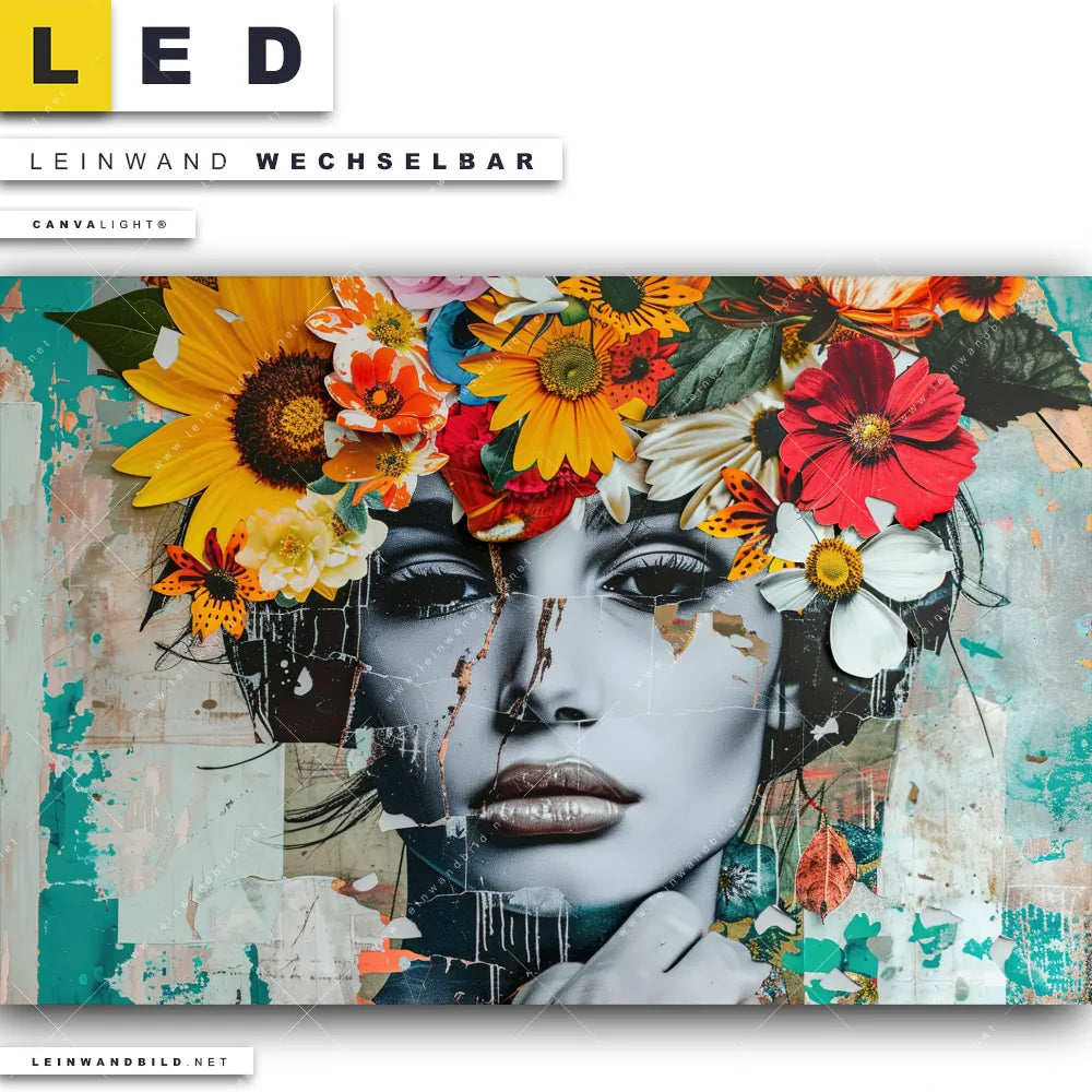 Du bist auf der Suche nach einem Blumen - Botanik, Porträts - Menschen LED Leinwandbild im Querformat? Begriffe wie Blumen, Gesicht, Haare, Augen, Lippen, Blüten haben Dich auf der Suche nach Deinem neuen XXL LED Wandbild mit wechselbarer Leinwand inspiriert? Farben wie Türkis, Gelb , Grau dürfen auf Deinem neuen breiten Leinwand-LED-Bild nicht fehlen und Leuchtbilder im Abstrakt, Modern Art, Floral Stil passen perfekt zu Deinem Einrichtungsstil?