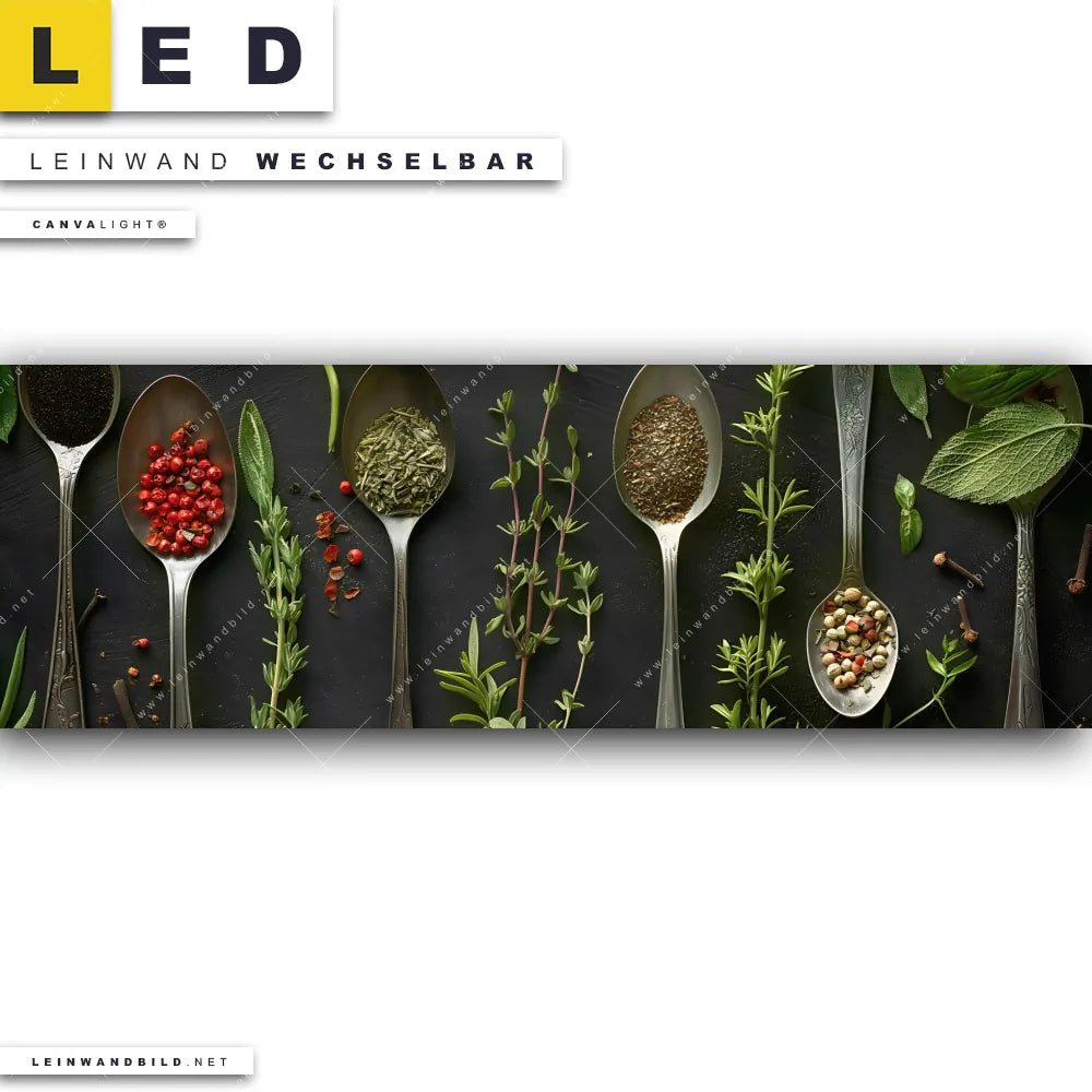 Du bist auf der Suche nach einem Essen - Trinken LED Leinwandbild im Panorama-Format? Begriffe wie Löffel, Besteck, Kräuter, Gewürze, kochen, Zutaten, Lebensmittel, Geschmack, Aromen haben Dich auf der Suche nach Deinem neuen XXL LED Wandbild mit wechselbarer Leinwand inspiriert? Farben wie Silber, Schwarz, Grün dürfen auf Deinem neuen extra breiten Leinwand-LED-Bild nicht fehlen und Leuchtbilder im Natürlich - Realistisch Stil passen perfekt zu Deinem Einrichtungsstil?