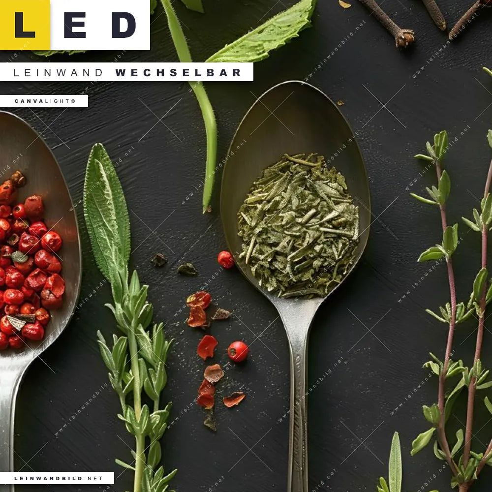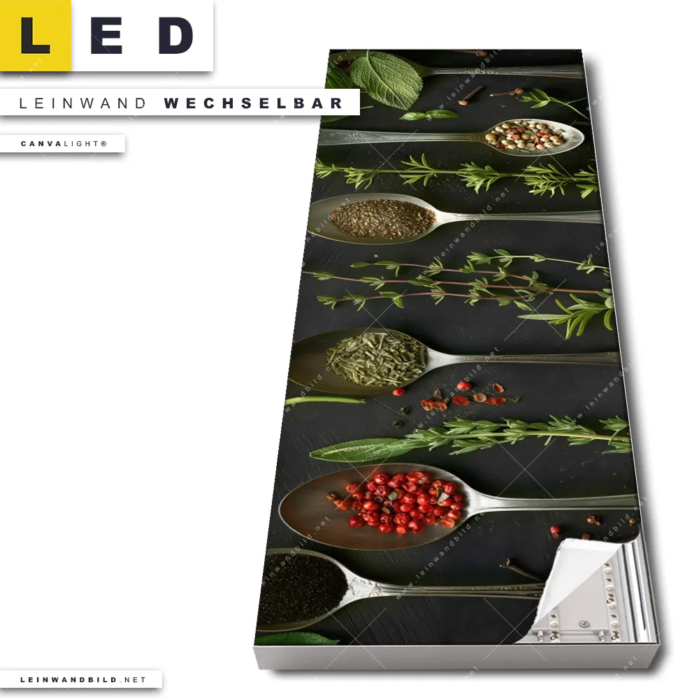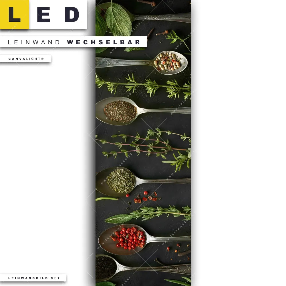 Du bist auf der Suche nach einem Essen - Trinken LED Leinwandbild im Schmalen Format? Begriffe wie Löffel, Besteck, Kräuter, Gewürze, kochen, Zutaten, Lebensmittel, Geschmack, Aromen haben Dich auf der Suche nach Deinem neuen XXL LED Wandbild mit wechselbarer Leinwand inspiriert? Farben wie Silber, Schwarz, Grün dürfen auf Deinem neuen Leinwand-LED-Bild im Panorama-Hochformat nicht fehlen und Leuchtbilder im Natürlich - Realistisch Stil passen perfekt zu Deinem Einrichtungsstil?