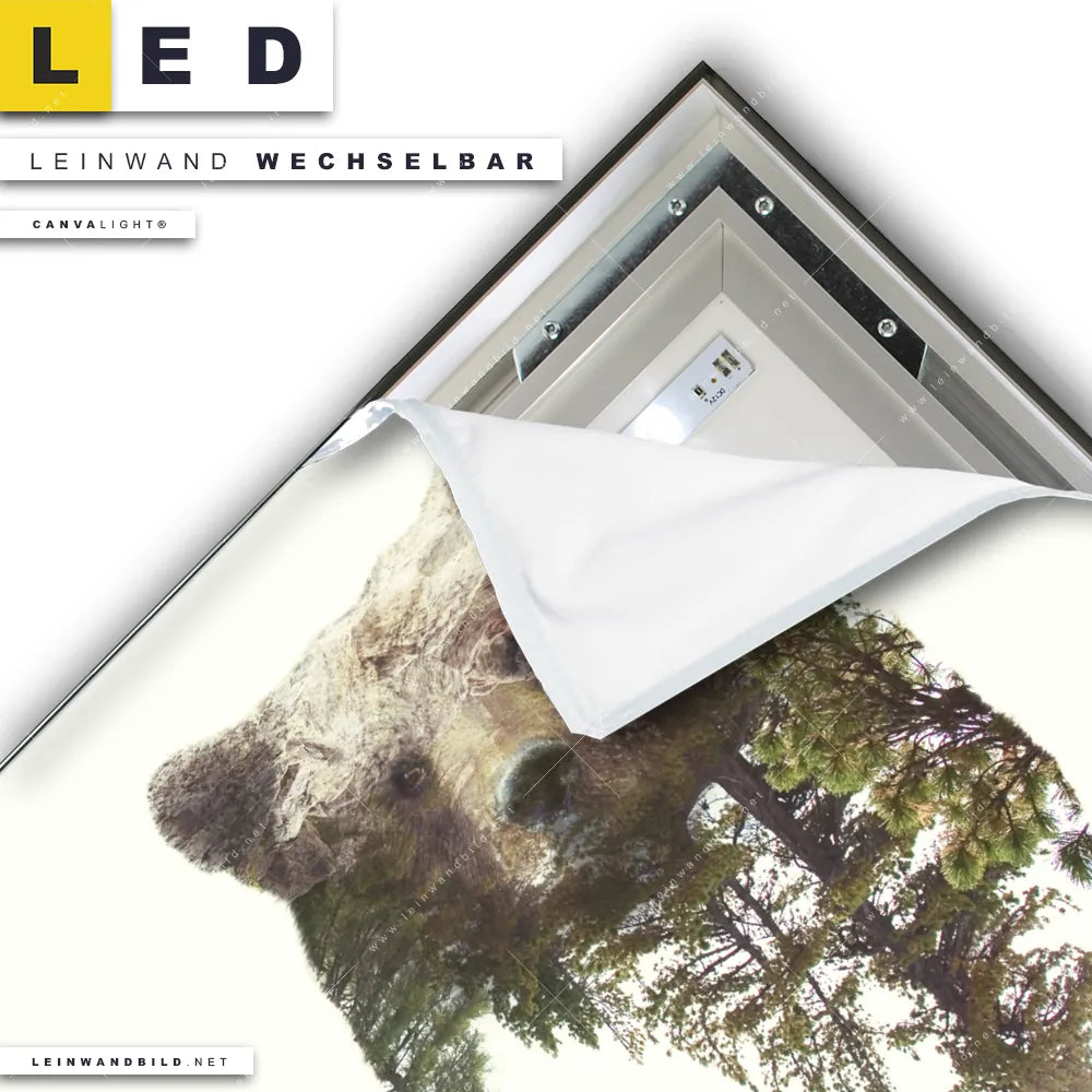 Du konfigurierst Dein individuelles LED Leinwandbild Canvalight® TEX | Bär & Wald No.1 | Quadrat und wir produzieren es NEU für Dich. Unsere Tierwelt LED Bilder mit wechselbarer Textil-Leinwand sind KEINE Lagerware. Du bist Dir unsicher, welches Motiv oder Format das richtige für dein individuelles Canvalight® Leuchtbild ist, dann helfen wir dir gerne weiter und beraten dich!