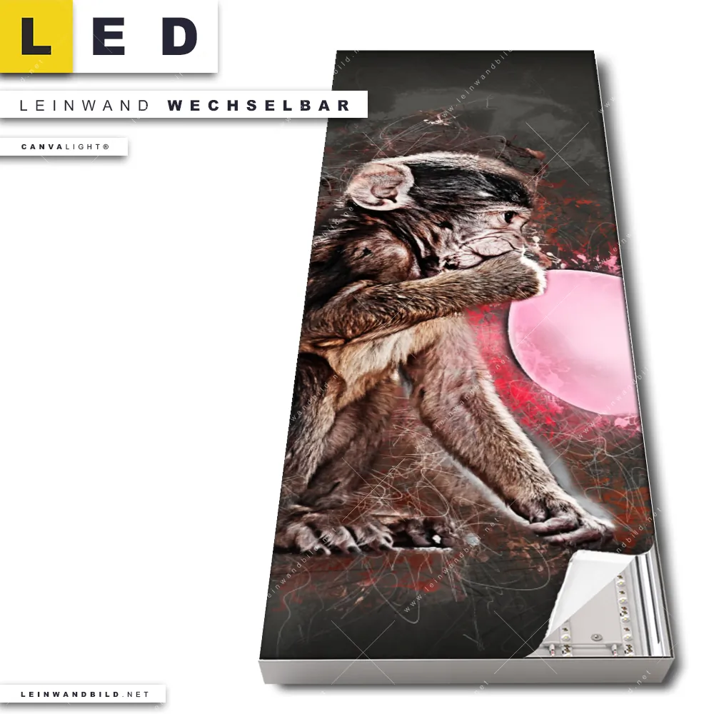 Du bist auf der Suche nach einem Tierwelt LED Leinwandbild im Schmalen Format? Begriffe wie Tier, Affe, Monkey, Kaugummi, Bubble Gum, lustig, Kunst, Ballon, Luftballon haben Dich auf der Suche nach Deinem neuen XXL LED Wandbild mit wechselbarer Leinwand inspiriert? Farben wie Pink, Rosa, Schwarz dürfen auf Deinem neuen Leinwand-LED-Bild im Panorama-Hochformat nicht fehlen und Leuchtbilder im Abstrakt, Modern Art, Grunge Stil passen perfekt zu Deinem Einrichtungsstil?