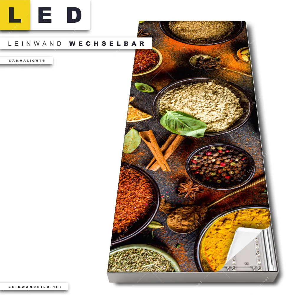Du bist auf der Suche nach einem Essen - Trinken LED Leinwandbild im Schmalen Format? Begriffe wie Gewürze, Kräuter, kochen, Chili, Pfeffer, Ingwer, Paprika, Küche, Essen, Lebensmittel haben Dich auf der Suche nach Deinem neuen XXL LED Wandbild mit wechselbarer Leinwand inspiriert? Farben wie Braun, Beige, Grün, Orange, Rot, Ocker, Bunt dürfen auf Deinem neuen Leinwand-LED-Bild im Panorama-Hochformat nicht fehlen und Leuchtbilder im Modern Art, Natürlich - Realistisch Stil passen perfekt zu Deinem Einrichtungsstil?