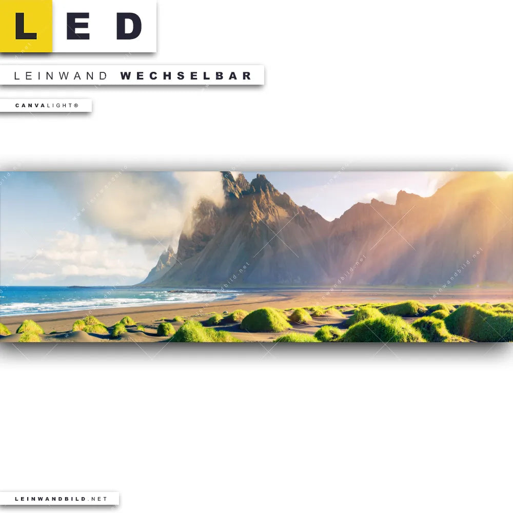 Du bist auf der Suche nach einem Landschaften LED Leinwandbild im Panorama-Format? Begriffe wie Modern, Meer, Strand, Sand, Wasser, Island, Urlaub haben Dich auf der Suche nach Deinem neuen XXL LED Wandbild mit wechselbarer Leinwand inspiriert? Farben wie Blau, Weiss, Grün, Hellgrün dürfen auf Deinem neuen extra breiten Leinwand-LED-Bild nicht fehlen und Leuchtbilder im Natürlich - Realistisch Stil passen perfekt zu Deinem Einrichtungsstil?