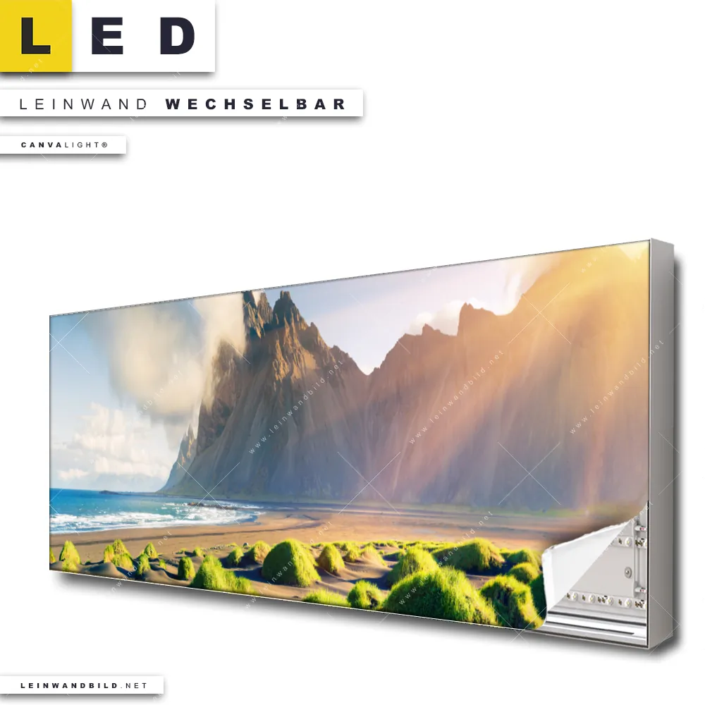 Du konfigurierst Dein individuelles LED Leinwandbild Canvalight® TEX | Beeindruckendes Island | Panorama und wir produzieren es NEU für Dich. Unsere Landschaften LED Bilder mit wechselbarer Textil-Leinwand sind KEINE Lagerware. Du bist Dir unsicher, welches Motiv oder Format das richtige für dein individuelles Canvalight® Leuchtbild ist, dann helfen wir dir gerne weiter und beraten dich!