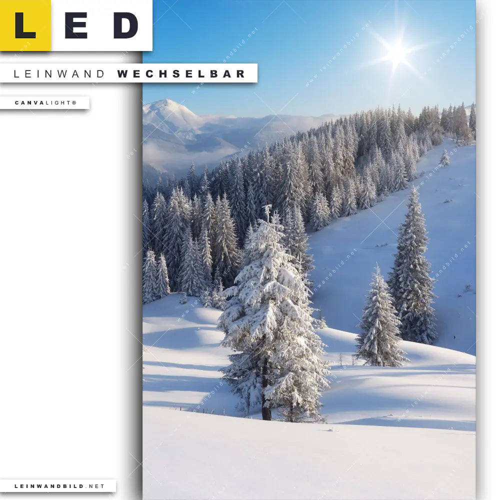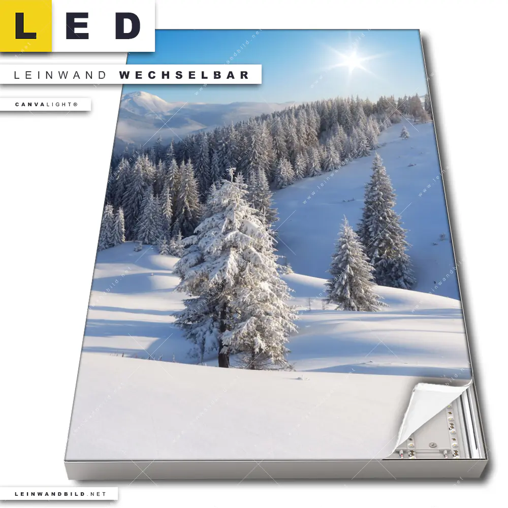 Du bist auf der Suche nach einem Landschaften, Winter LED Leinwandbild im Hochformat? Begriffe wie Berge, Gebirge, Schneelandschaft, Winter, Schnee, Weihnachten, Nadelwald, Tannenbäume, Sonnenlicht, Sonne, Sonnenaufgang haben Dich auf der Suche nach Deinem neuen XXL LED Wandbild mit wechselbarer Leinwand inspiriert? Farben wie Blau, Weiss, Grau dürfen auf Deinem neuen Leinwand-LED-Bild nicht fehlen und Leuchtbilder im Natürlich - Realistisch Stil passen perfekt zu Deinem Einrichtungsstil?