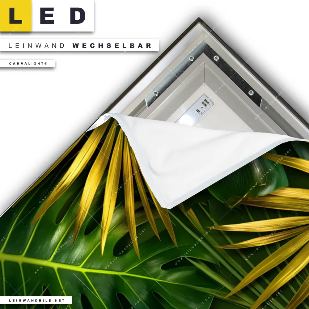 Du konfigurierst Dein individuelles LED Leinwandbild Canvalight® TEX | Blätter Gold Grün | Hochformat und wir produzieren es NEU für Dich. Unsere Blumen - Botanik, Muster - Texturen LED Bilder mit wechselbarer Textil-Leinwand sind KEINE Lagerware. Du bist Dir unsicher, welches Motiv oder Format das richtige für dein individuelles Canvalight® Leuchtbild ist, dann helfen wir dir gerne weiter und beraten dich!
