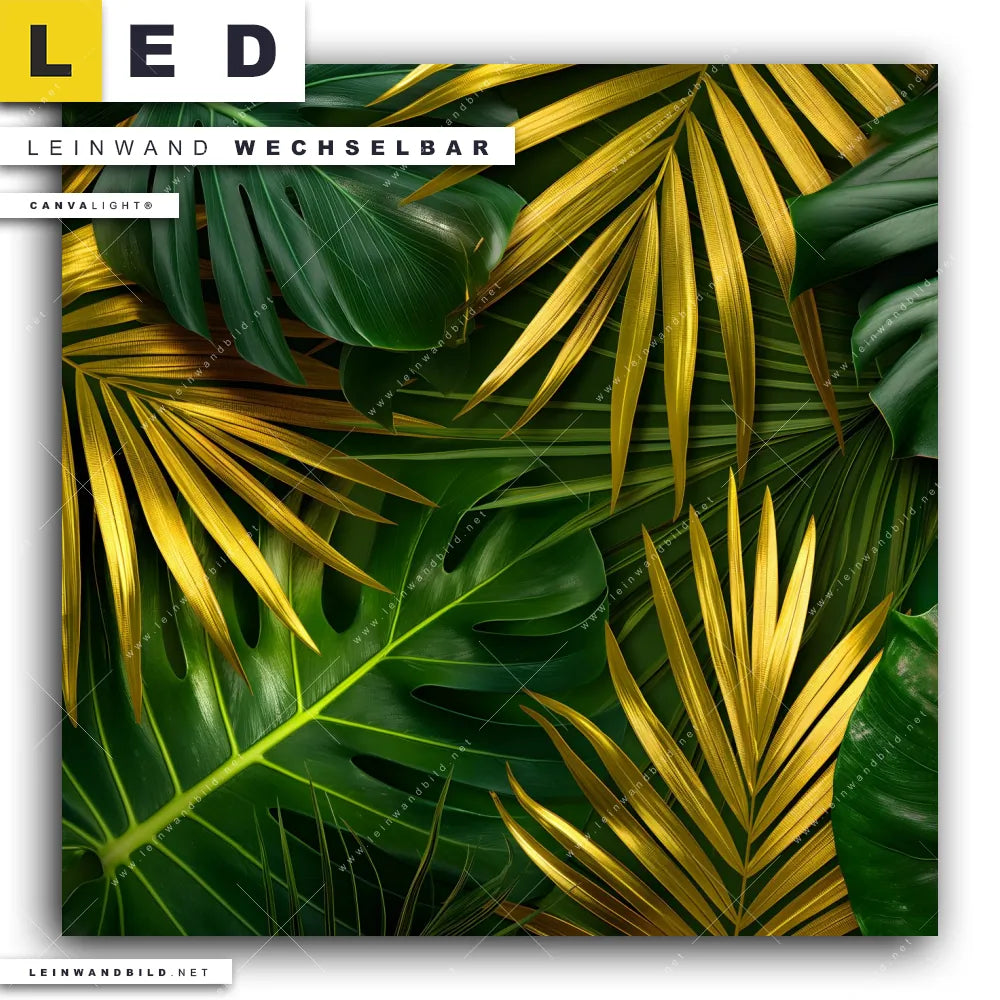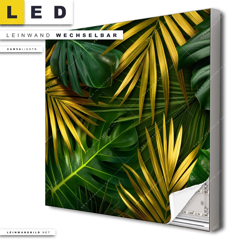 Du bist auf der Suche nach einem Blumen - Botanik, Muster - Texturen LED Leinwandbild im Quadratischen Format? Begriffe wie Monstera, Palmenblätter, Blätter, Pflanze, Natur, Nahaufnahme, Laub, Dschungel haben Dich auf der Suche nach Deinem neuen XXL LED Wandbild mit wechselbarer Leinwand inspiriert? Farben wie Gold, Grün dürfen auf Deinem neuen Leinwand-LED-Bild nicht fehlen und Leuchtbilder im Floral, Modern Art Stil passen perfekt zu Deinem Einrichtungsstil?