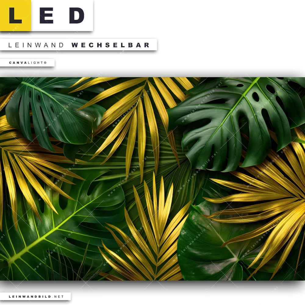 Du bist auf der Suche nach einem Blumen - Botanik, Muster - Texturen LED Leinwandbild im Querformat? Begriffe wie Monstera, Palmenblätter, Blätter, Pflanze, Natur, Nahaufnahme, Laub, Dschungel haben Dich auf der Suche nach Deinem neuen XXL LED Wandbild mit wechselbarer Leinwand inspiriert? Farben wie Gold, Grün dürfen auf Deinem neuen breiten Leinwand-LED-Bild nicht fehlen und Leuchtbilder im Floral, Modern Art Stil passen perfekt zu Deinem Einrichtungsstil?